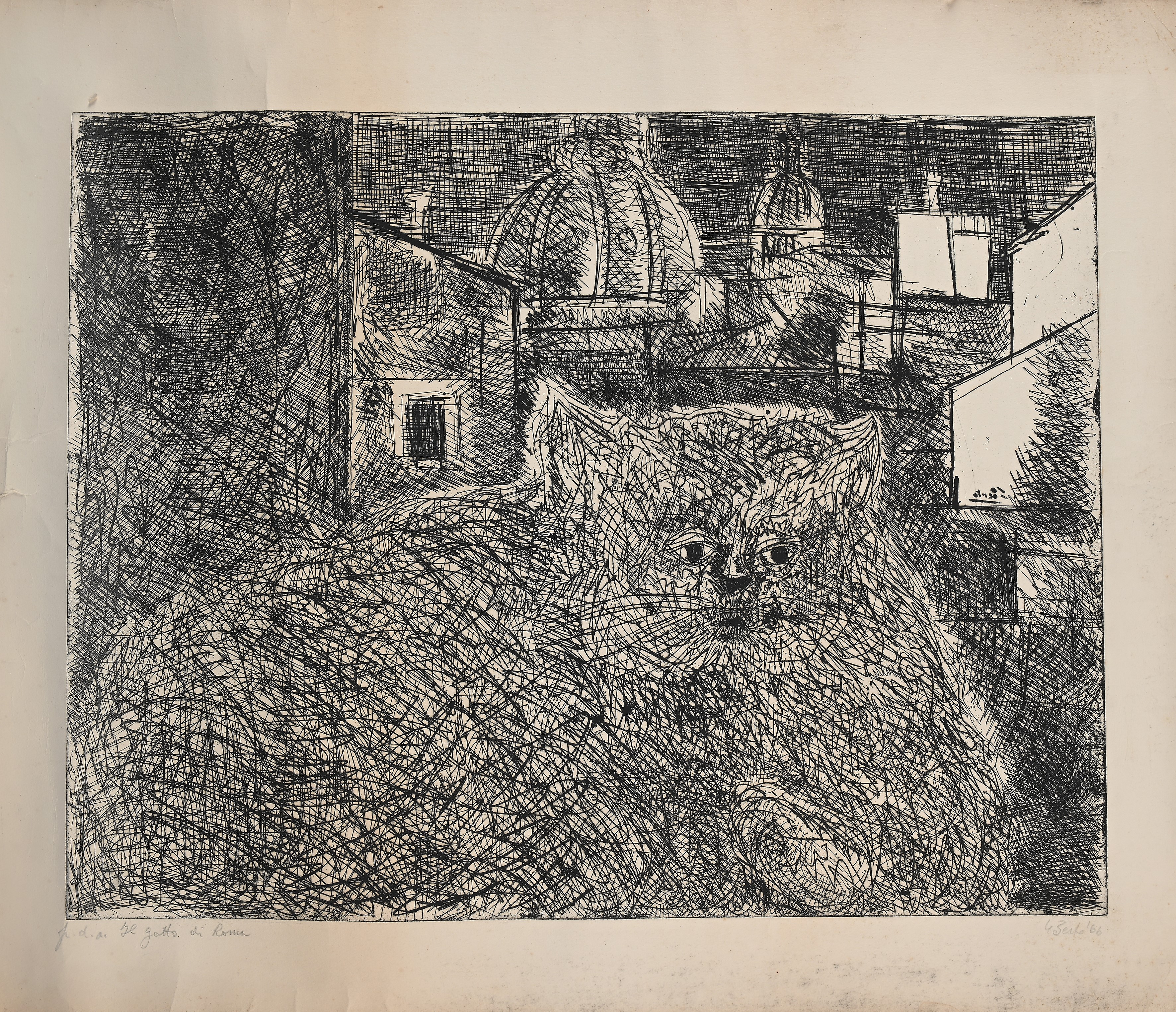 2) Il Gatto di Roma, 1966, acquaforte, cm 77x63. Firma, numerazione e data "Berto 66, Il Gatto di Roma, P.d.a.".