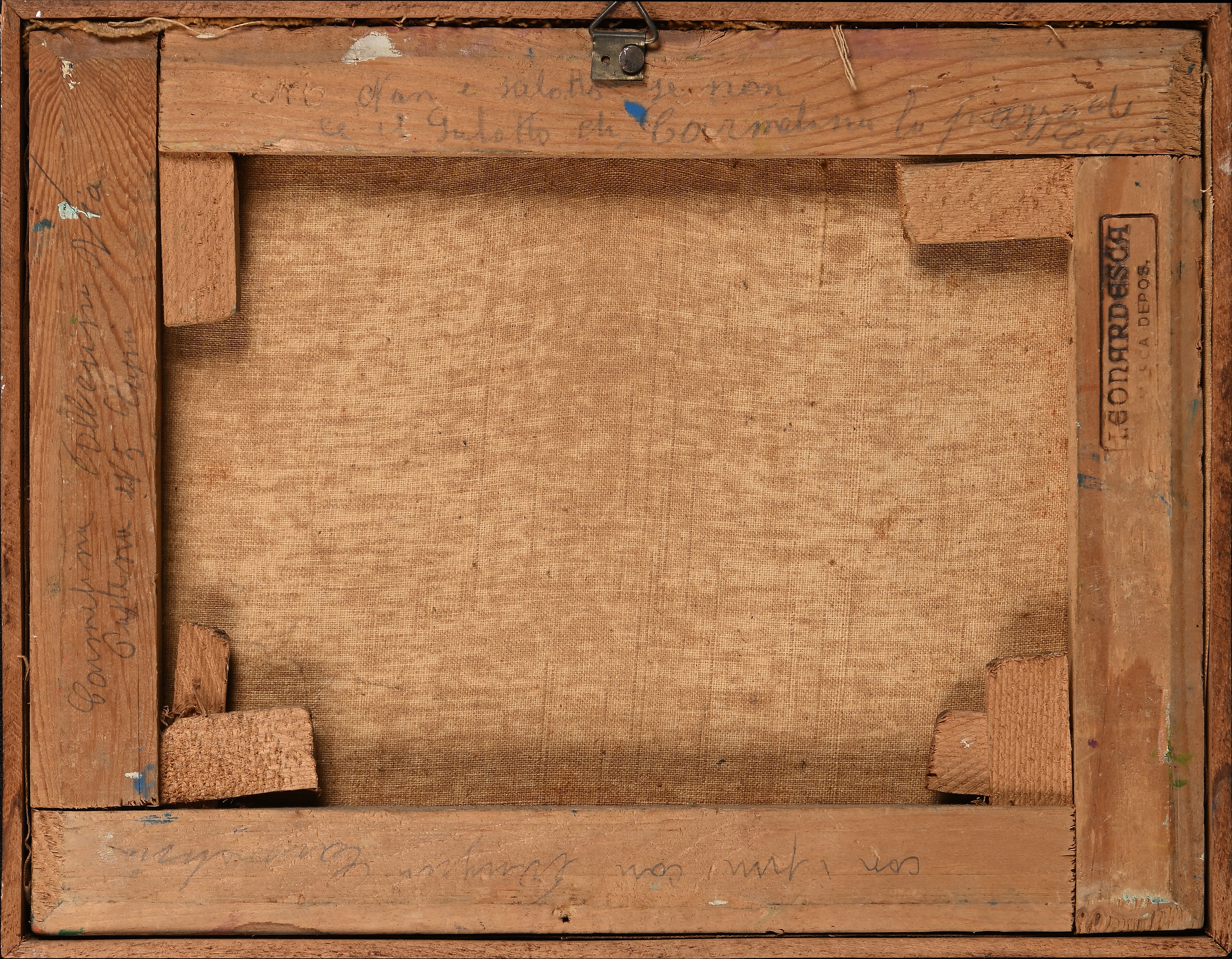 Firma in basso a sinistra "Carmelina A. Capri". Al verso reca a matita sul telaio "Non è salotto se non c'è il Gulotto di Carmelina la Piazza di Capri, Con i più cari auguri, Carmelina".