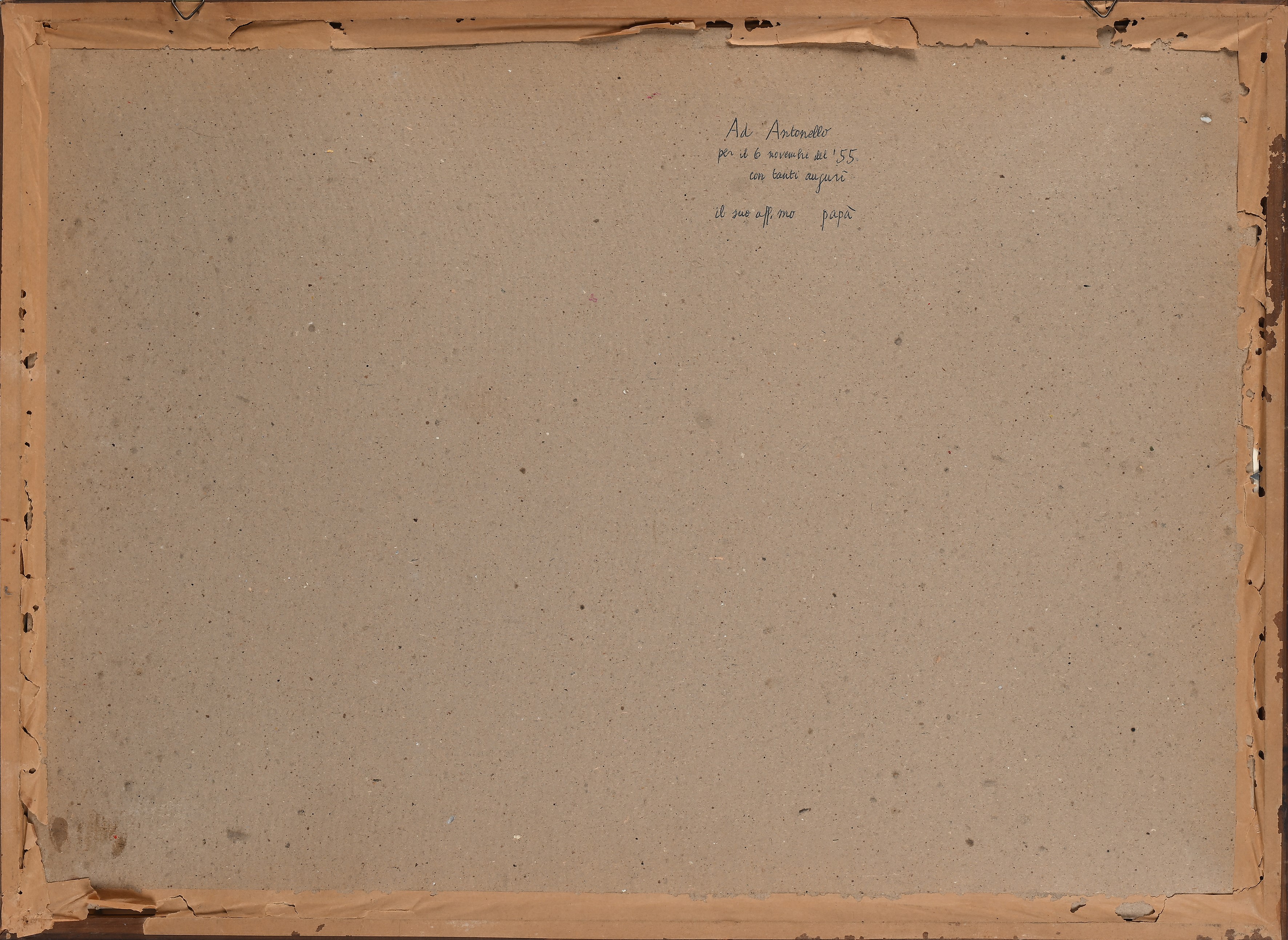 Firma e numerazione "Gentilini 48/100". Al verso reca dedica di Enrico per Antonello Falqui "Ad Antonello, per il 6 novembre del '55, con tanti auguri, il suo aff.mo papà".