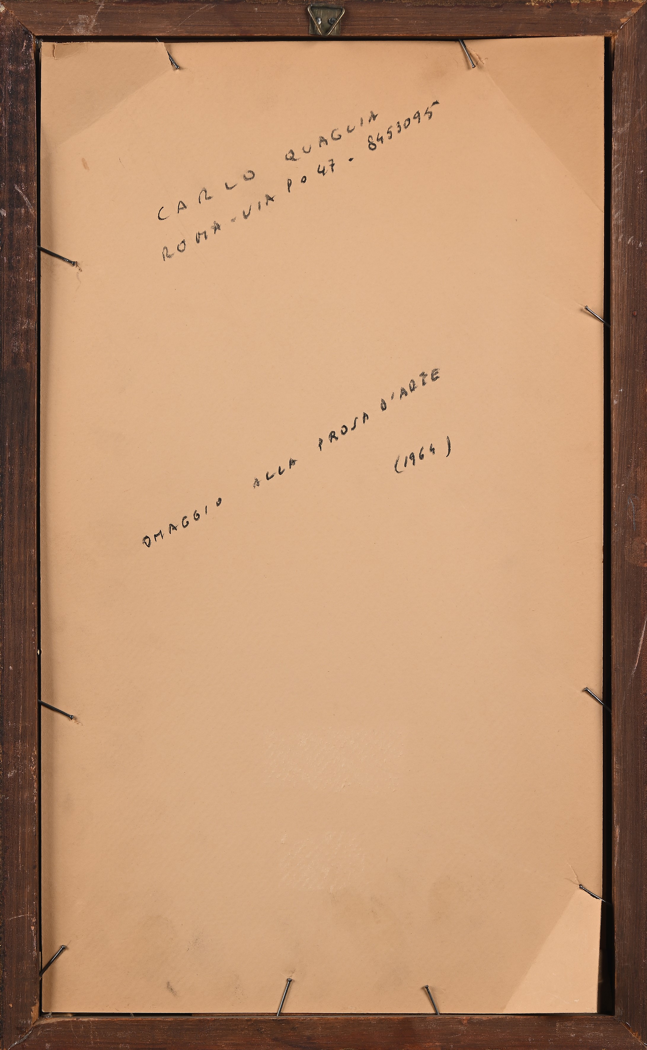 Firma in basso a sinistra "Quaglia". Al verso reca titolo e data "1964"
