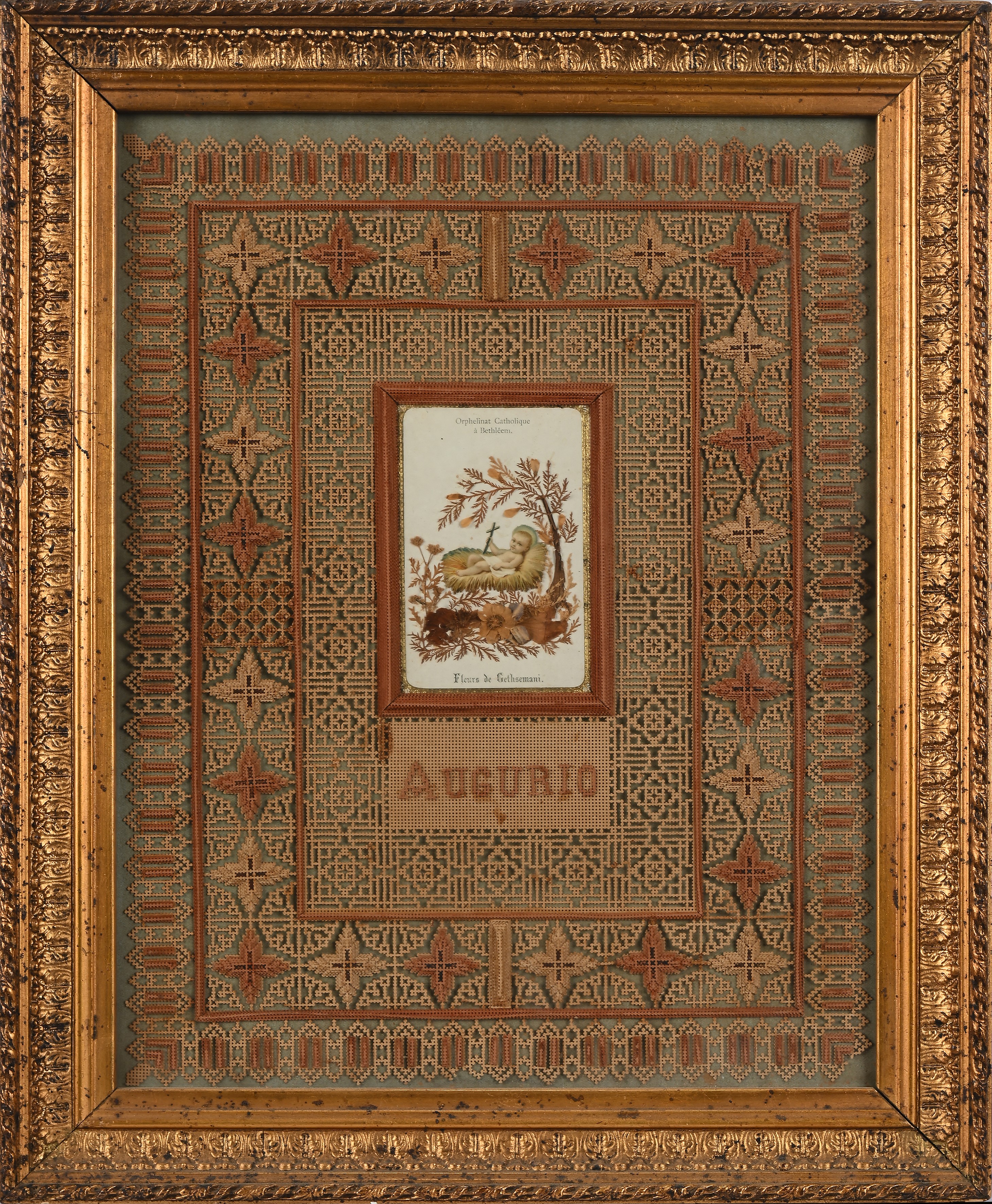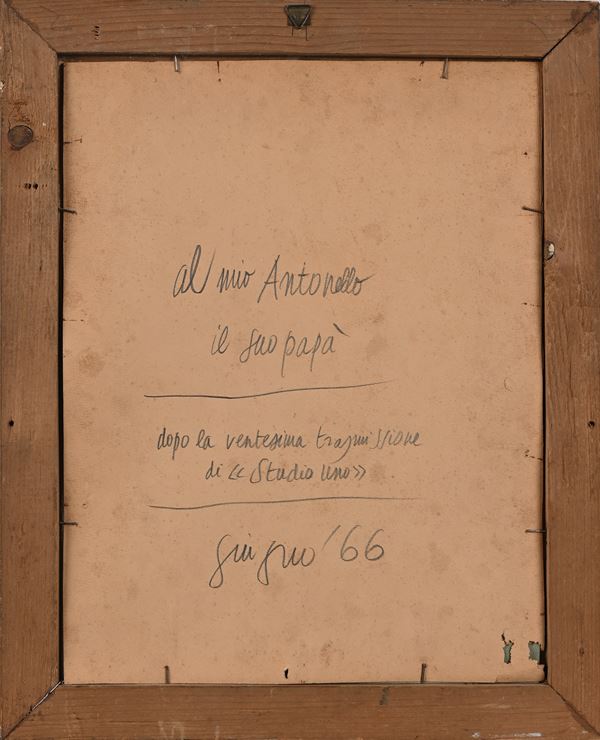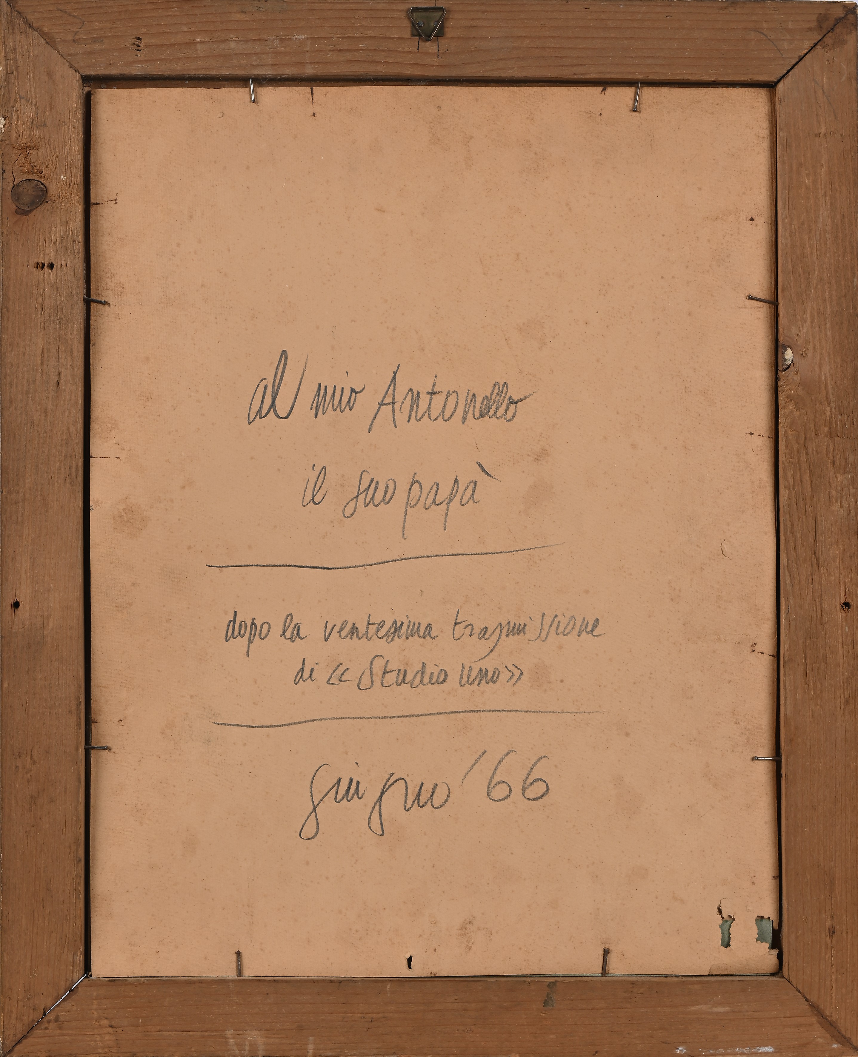 al centro un santino dell'Orfanotrofio cattolico di Betlemme con fiori di Getsemani. Al verso dedica manoscritta: "Al mio Antonello il suo Papà, dopo la ventesima trasmissione di Studio Uno, Giugno '66"