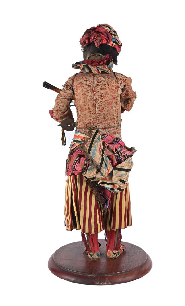 Figura polimaterica (legno, cartapesta, pelle) in abiti da gitana e mandolino in cartapesta; volto ricoperta di pelle bruna, occhi mobili di vetro, palpebre in pelle, bocca socchiusa con denti a vista; meccanica d'epoca a carillon (da revisionare), attivabile mediante una chiave che consente l'azione di suonare lo strumento muovendo la testa, gli occhi e le braccia; base circolare in legno. Difetti