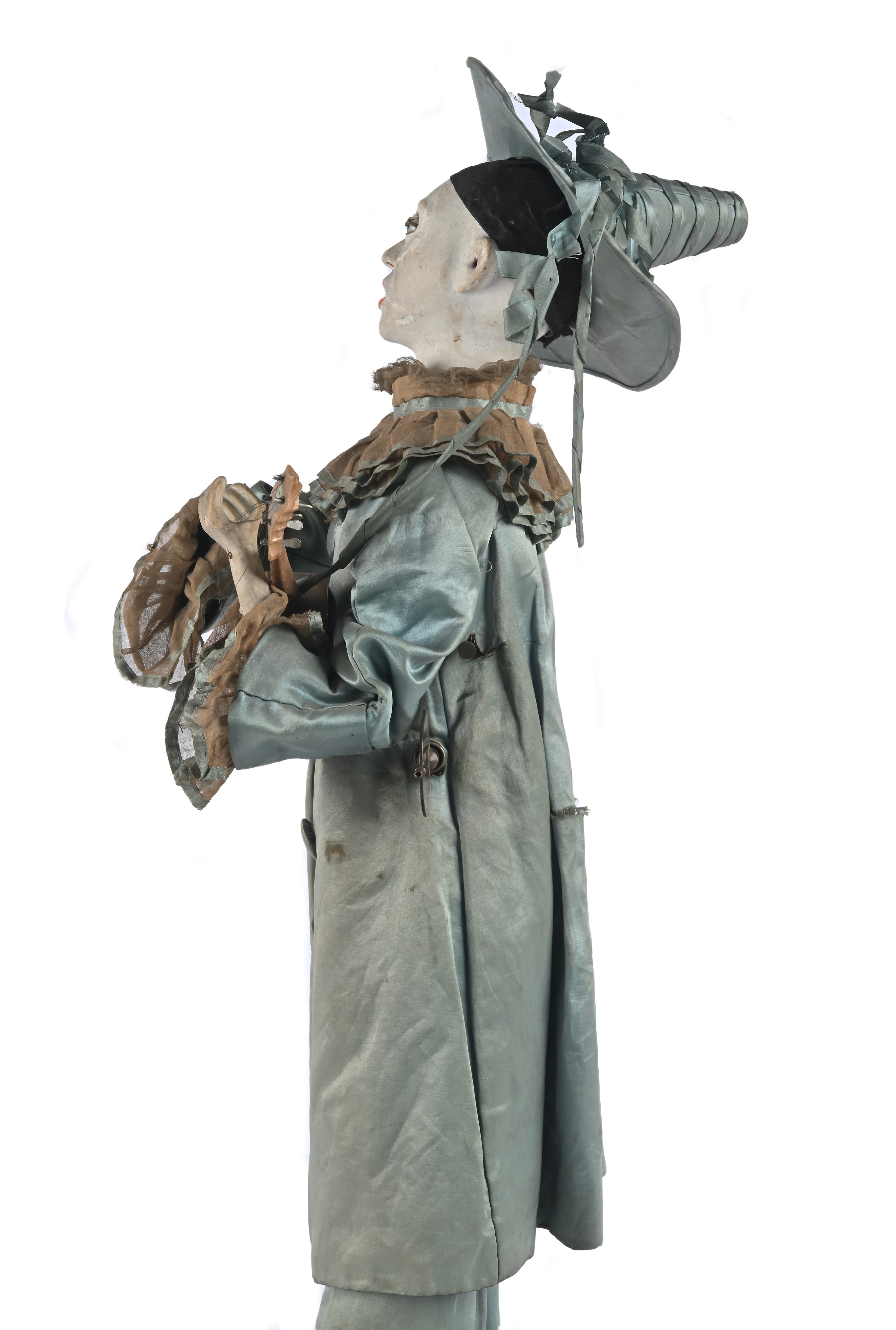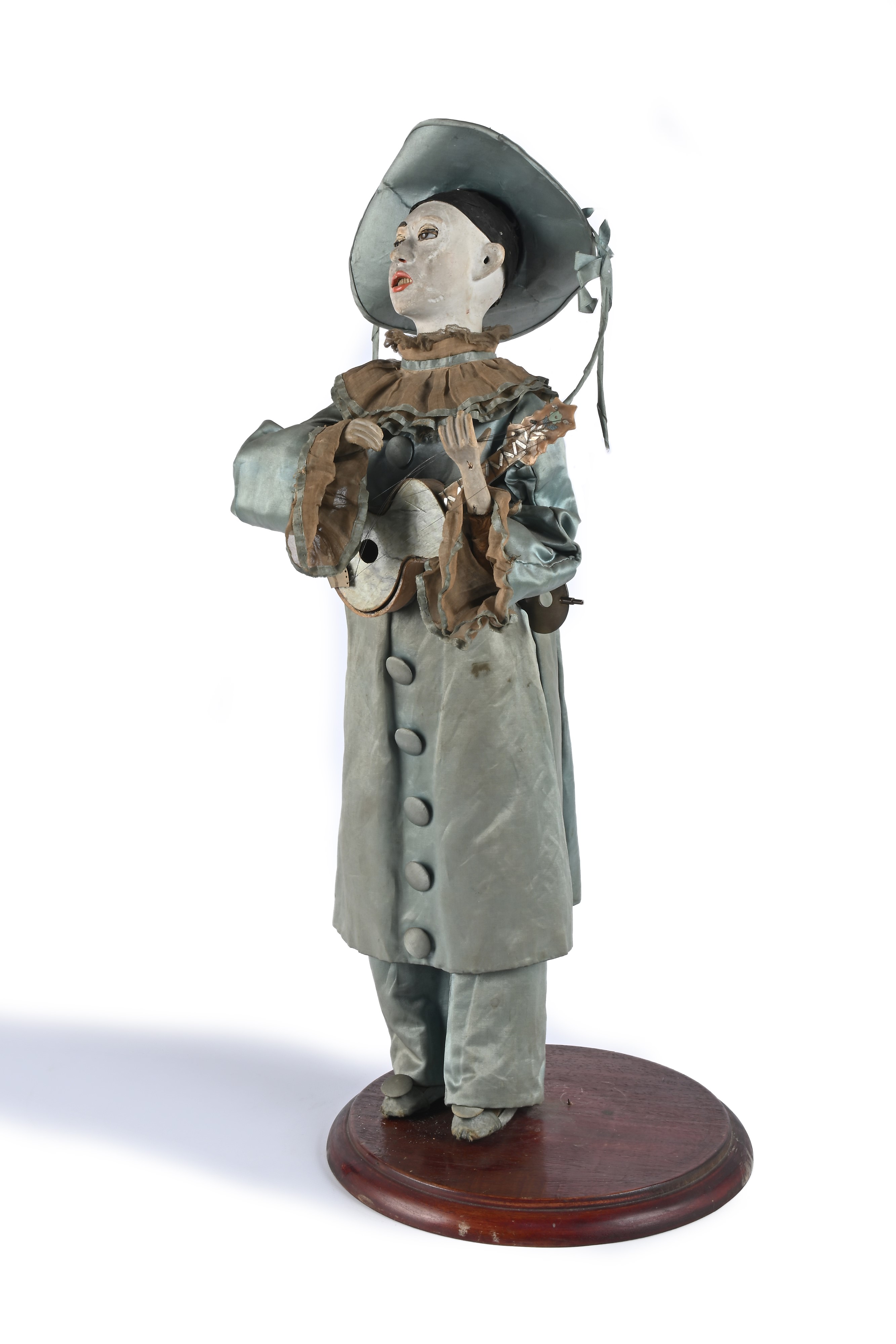 figura polimaterica (cartapesta e legno) in abiti da Pierrot con chitarra; occhi mobili di vetro, palpebre di pergamena, bocca socchiusa con denti a vista; meccanica d'epoca a carillon (da revisionare), attivabile mediante una chiave che consente l'azione di suonare lo strumento muovendo il braccio destro e la testa in avanti, indietro ed in rotazione; abito in seta azzurra, base circolare in legno. Difetti