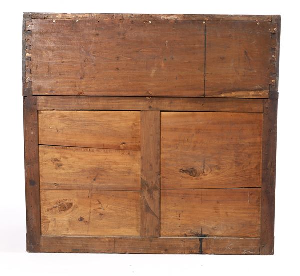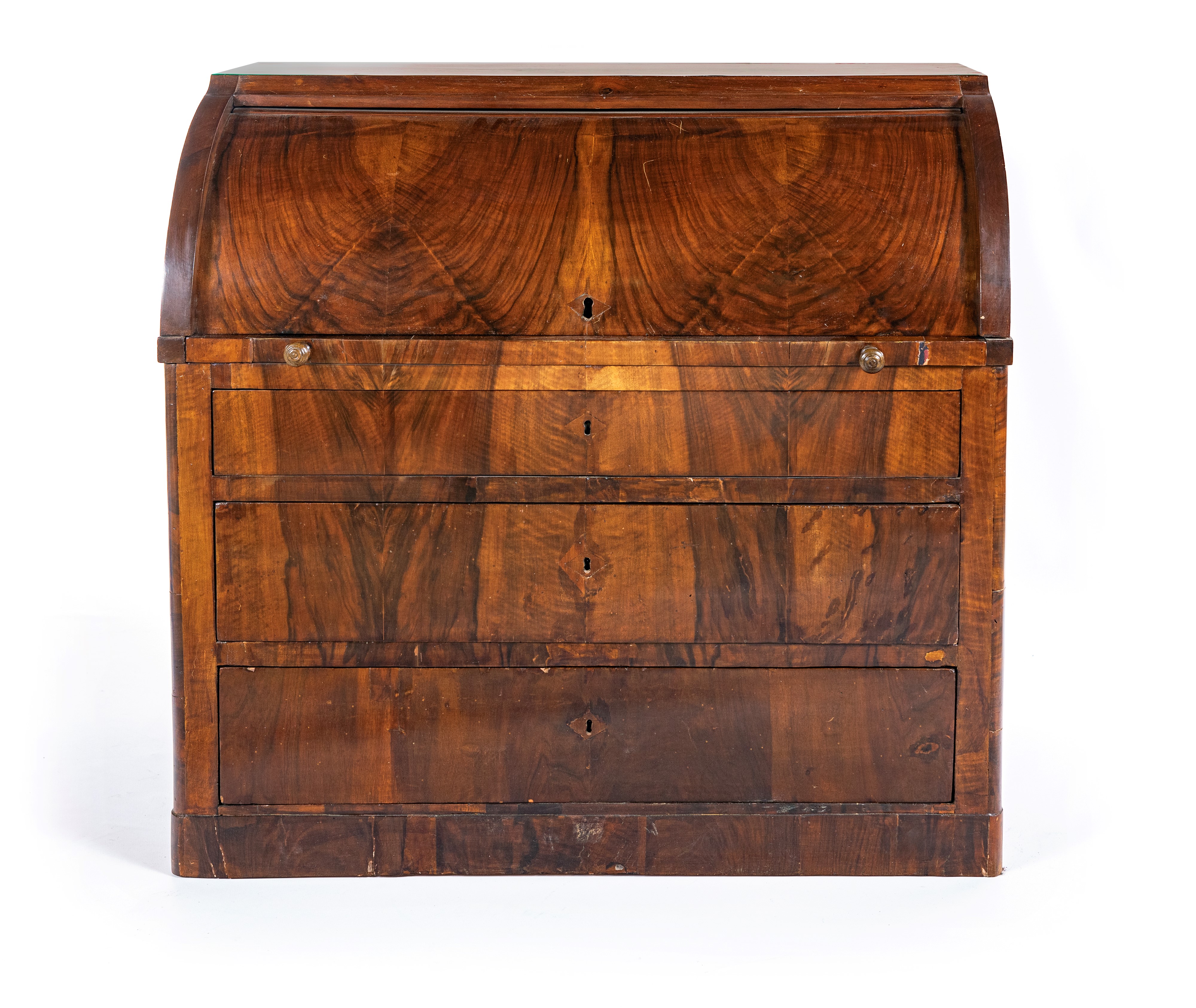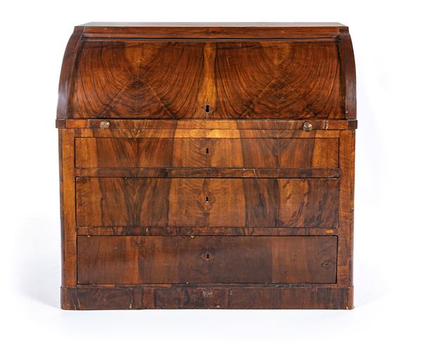 facciata suddivisa in tre cassetti sormontati da ripiano scrittoio estraibile rivestito in pelle e rullo a celare quattro scomparti e quattro tiretti