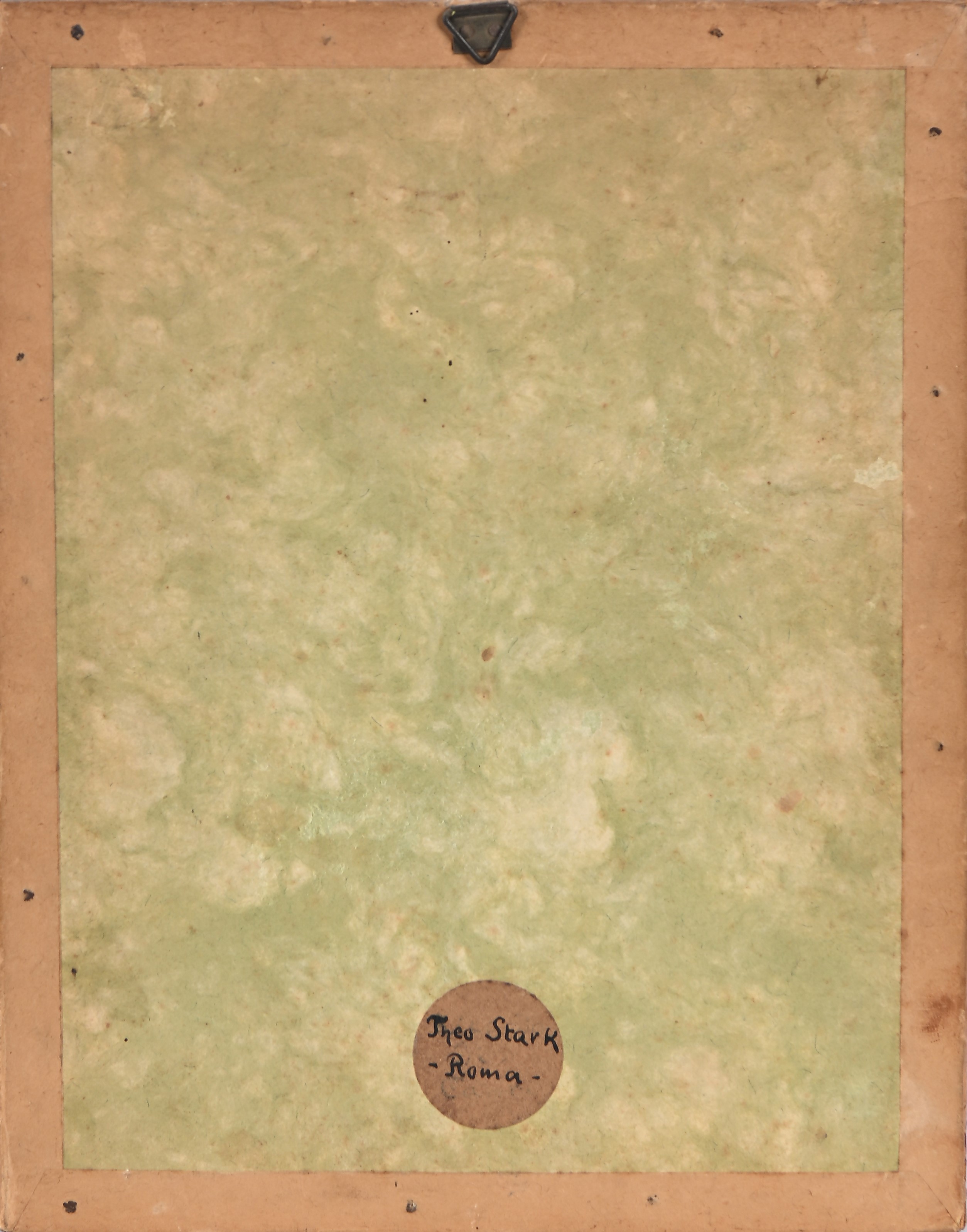 raffigurante Madonna col Bambino entro ghirlanda di corolle impreziosite da perline; tutt'intorno una trina di fili argentei; in cornice. Al verso etichetta cartacea con iscrizione manoscritta: Theo Stark Roma