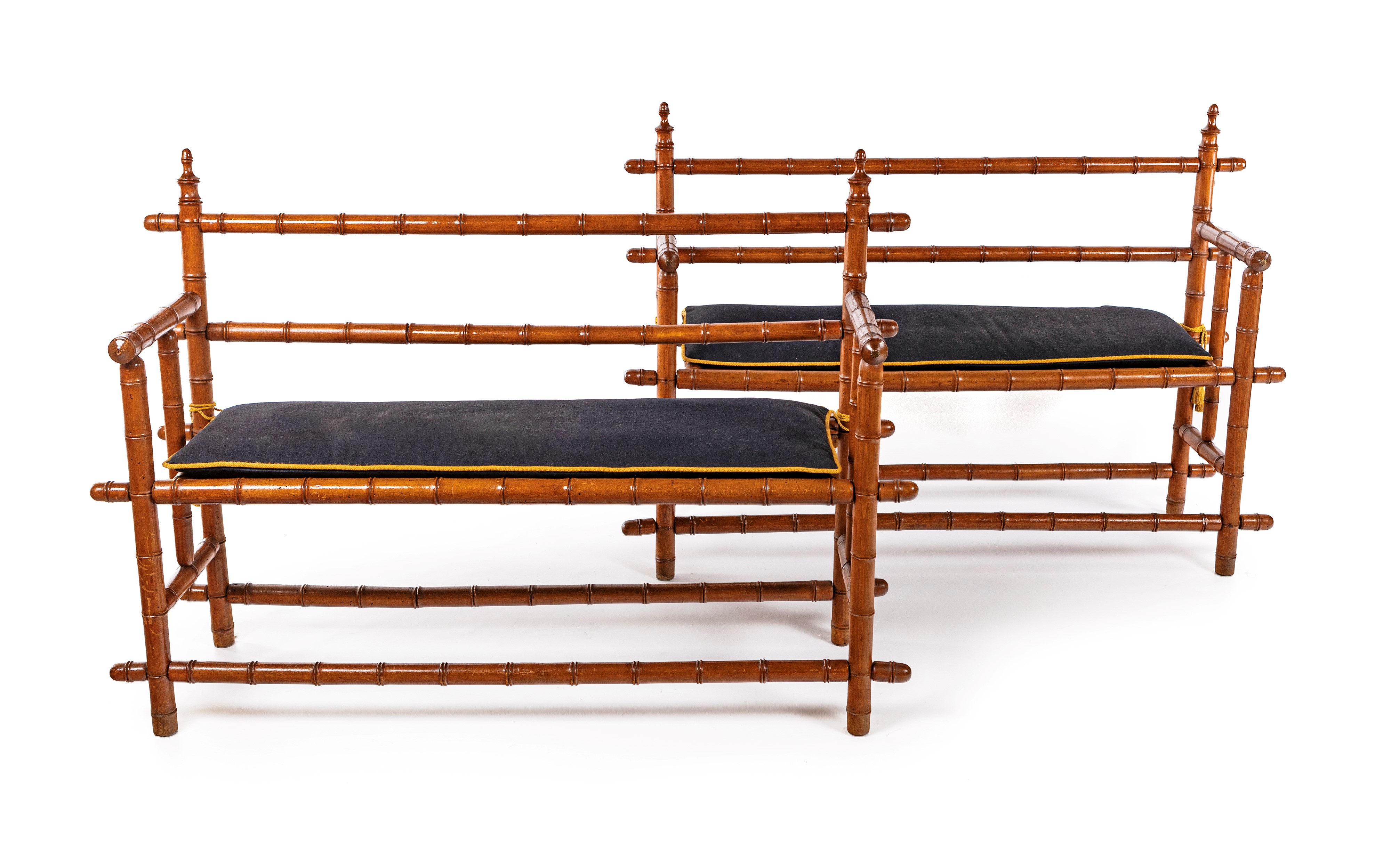 Coppia di divanetti di gusto coloniale vittoriano, prima metà del XX secolo