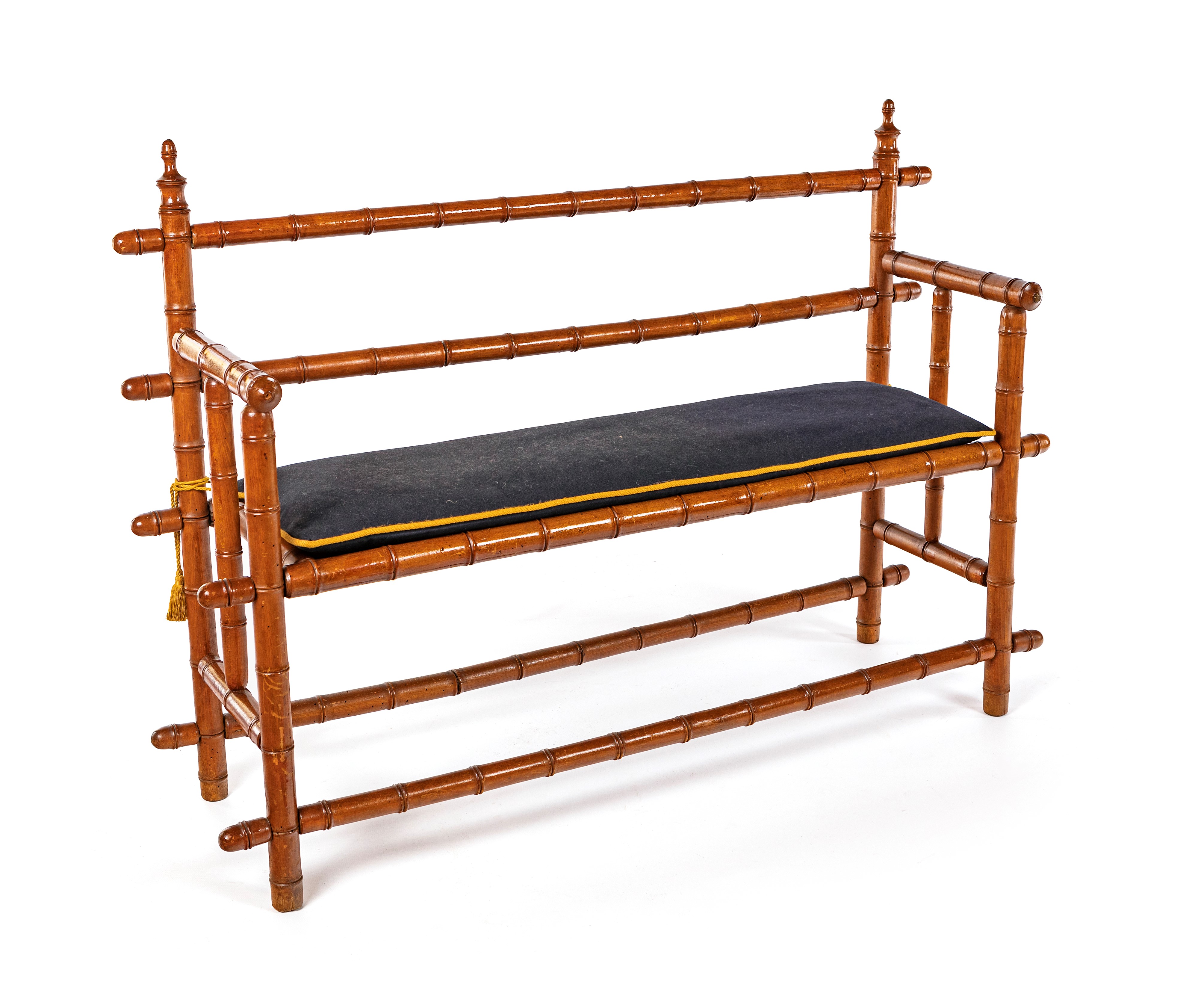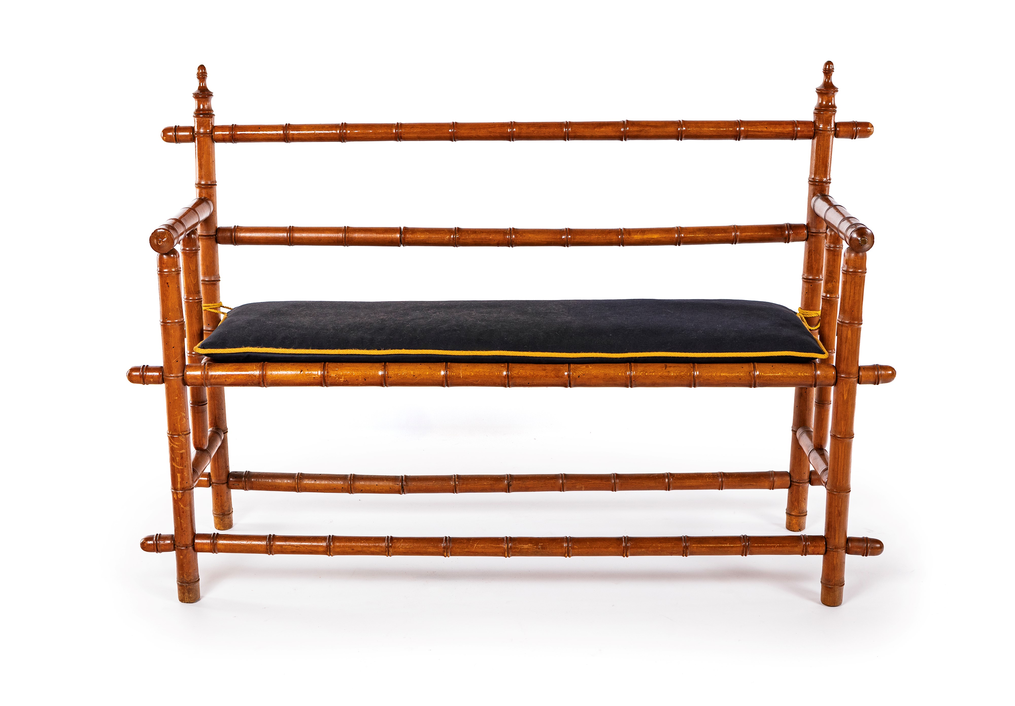 struttura a giorno di linea squadrata in legno tornito ad imitazione del bambù e sedili sormontati da cuscino