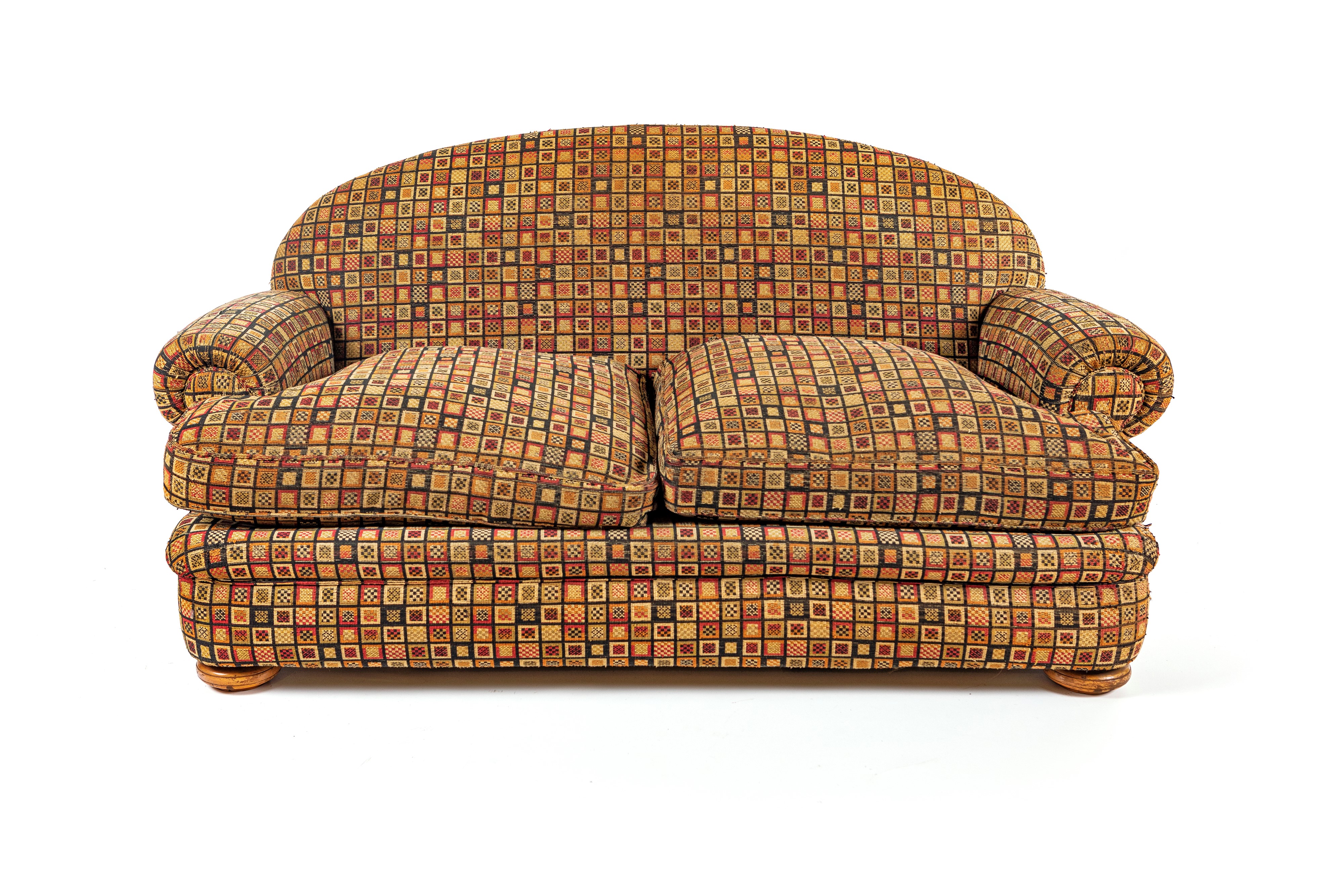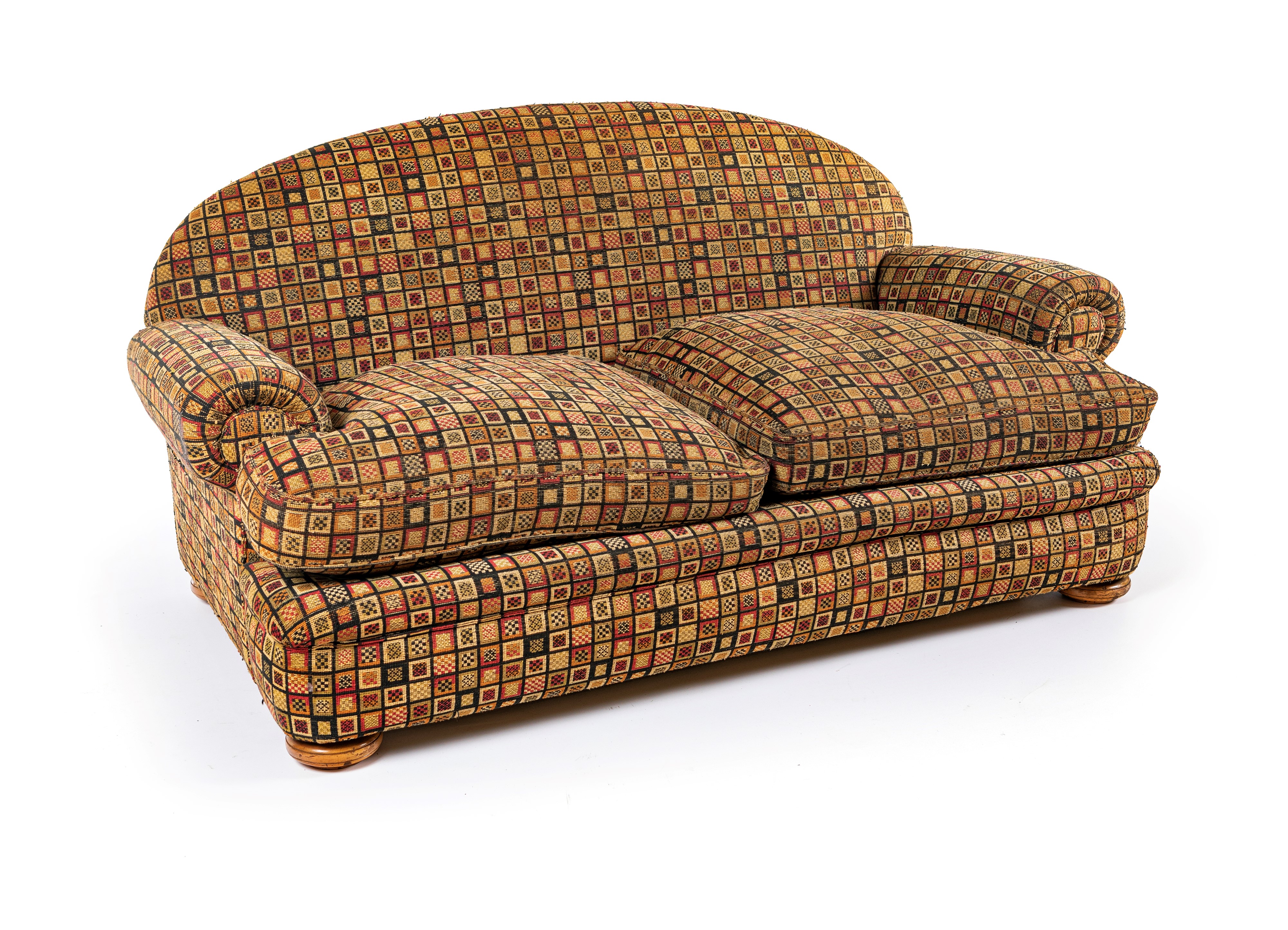 - struttura squadrata con schienale ad arco e seduta sormontata da cuscini, interamente imbottito e rivestito in tessuto a scacchi bouclé realizzati da un fitto ricamo a occhiello; passi piedi circolari in legno dolce