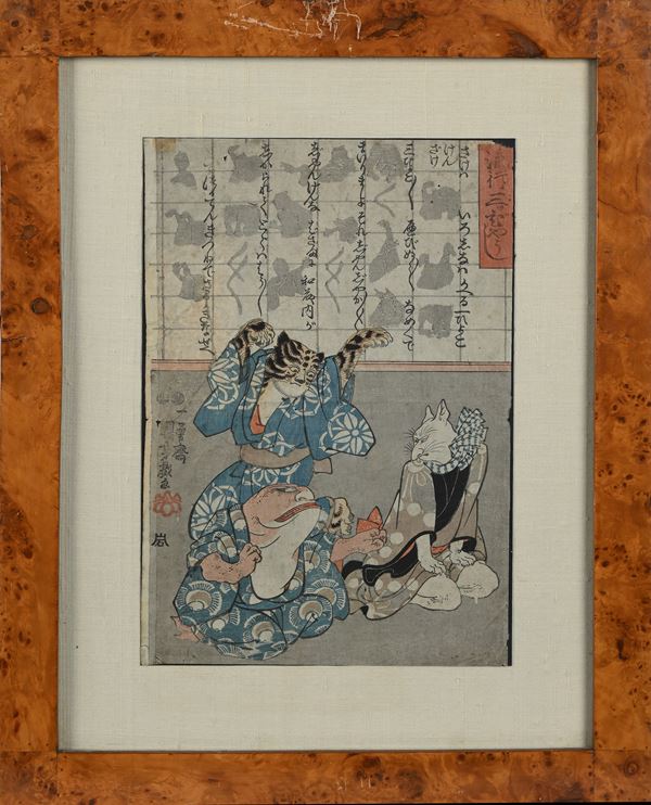 incisione tratta dalla serie raffigurante il gioco del Ken, spesso rappresentato come una danza nelle rappresentazioni del teatro Kabuki. Dopo l'imposizione nel 1842 di non diffondere stampe e disegni di attori, Kuniyoshi produsse numerosi disegni umoristici con ritratti di attori camuffati come animali o altri oggetti bizzarri, fantastici e macabri. Gli animali assomigliano agli attori Ichikawa Kuzô II (tigre), Nakamura Utaemon IV (rospo) e Matsumoto Kôshirô VI (volpe)