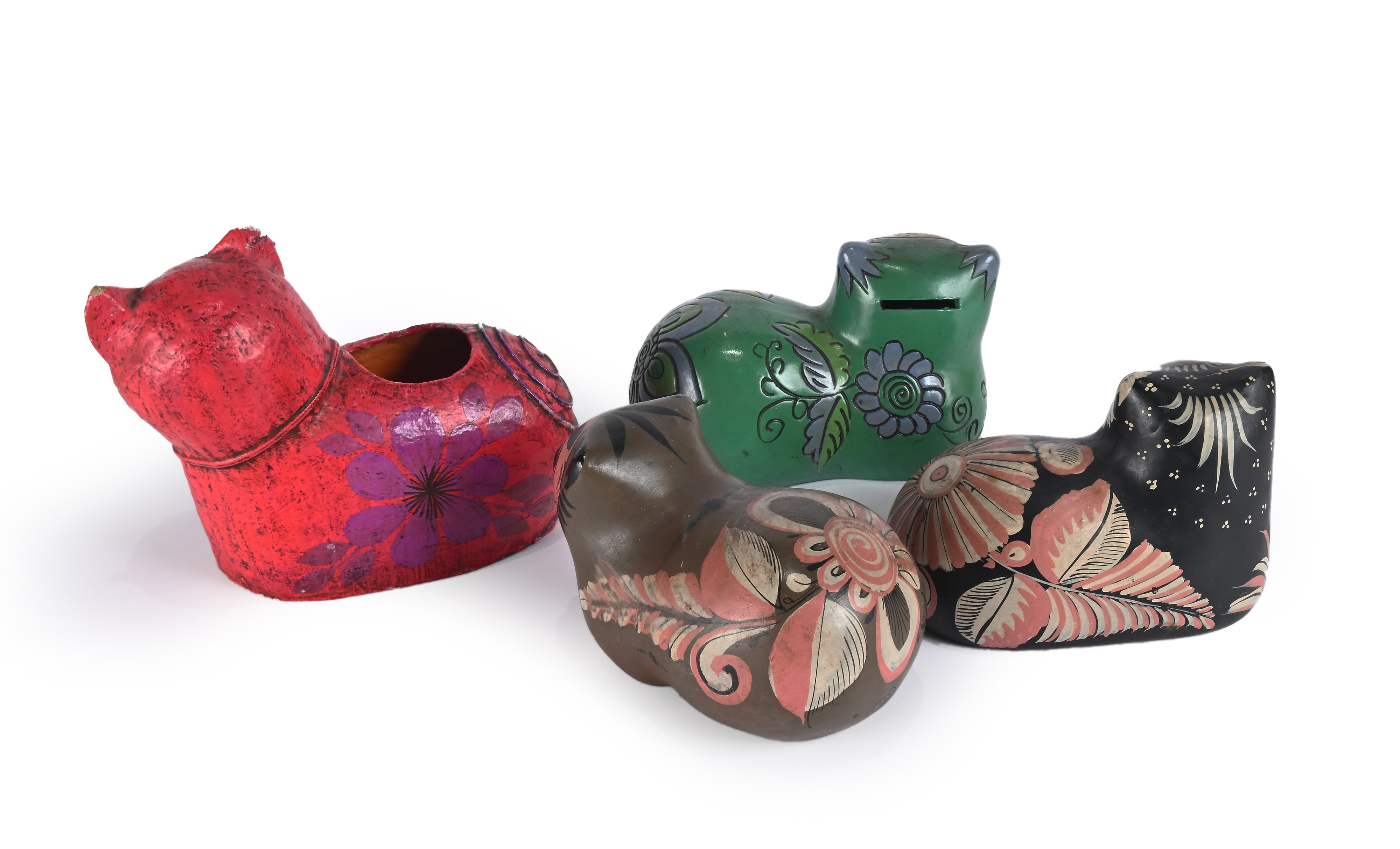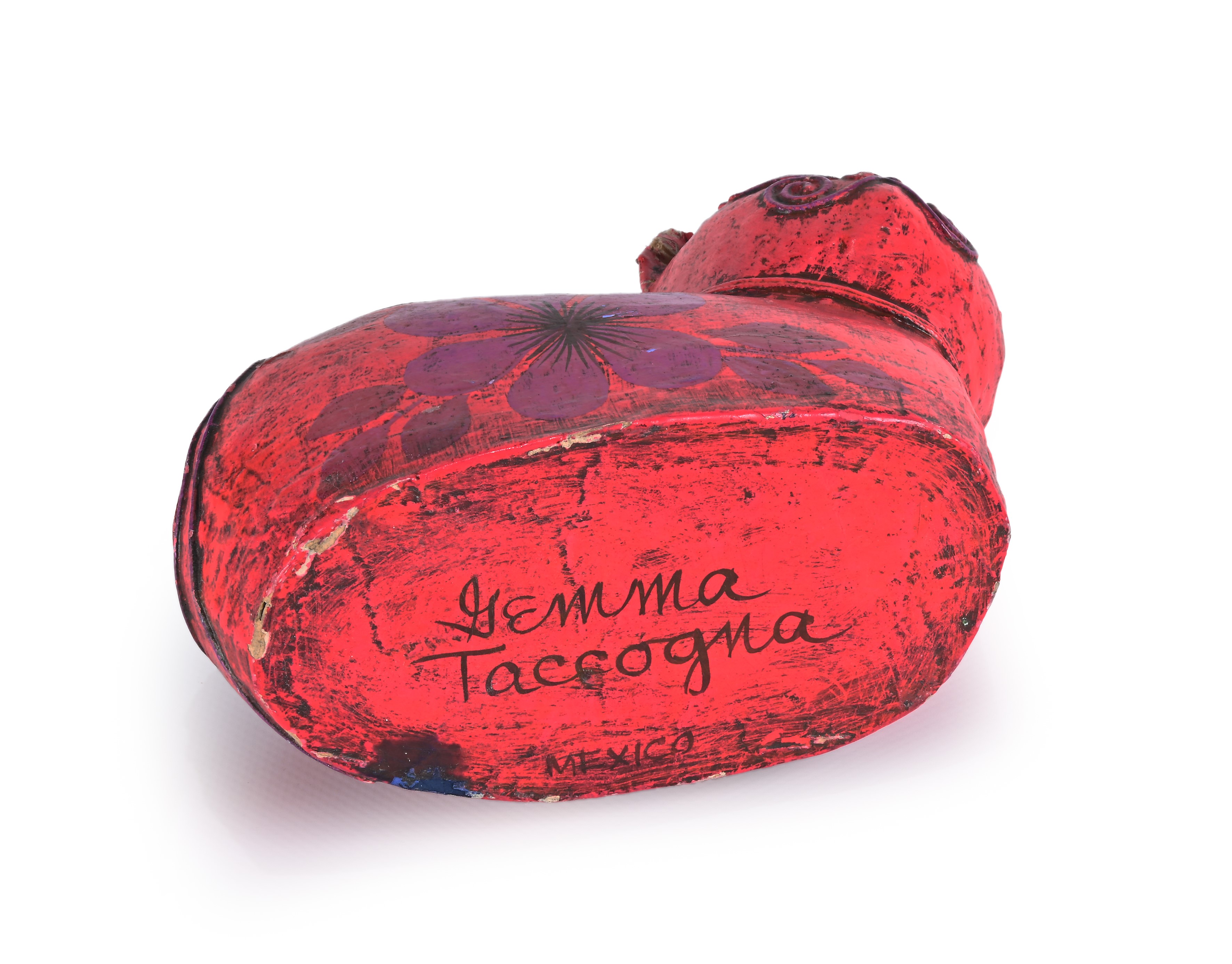 nero, marrone, verde caratterizzato da feritoia salvadanaio e in cartapesta rossa come portavaso a firma di Jemma Taccogna, artista italiana nata in provincia di Bari nel 1923 e trasferitasi in Messico nel 1954 quando era già una scultrice conosciuta a New York, aprì uno studio per la realizzazione di opere in cartapesta con sessanta dipendenti, denominato Artes Gemma, dando una spinta all'industria della cartapesta in Messico