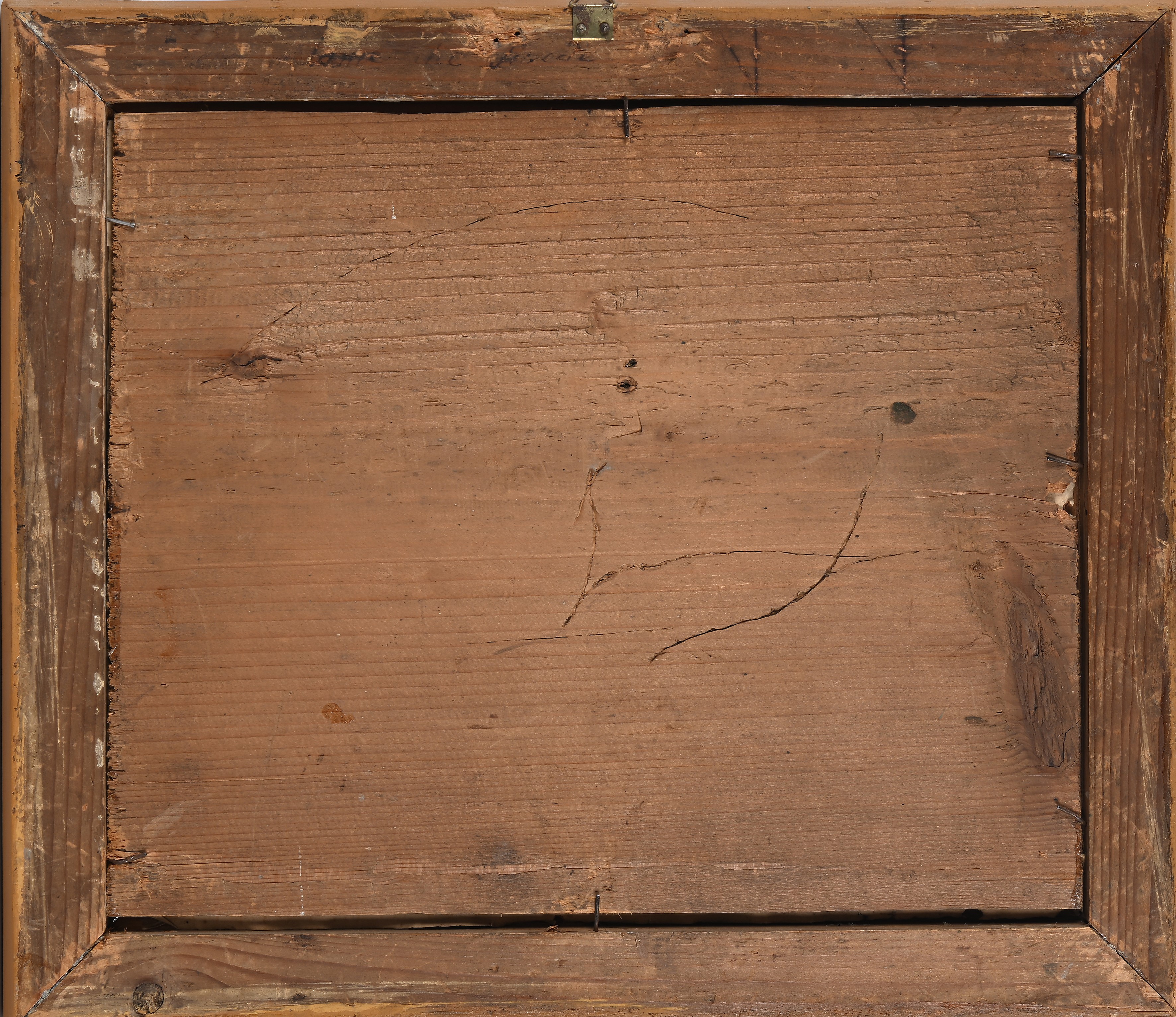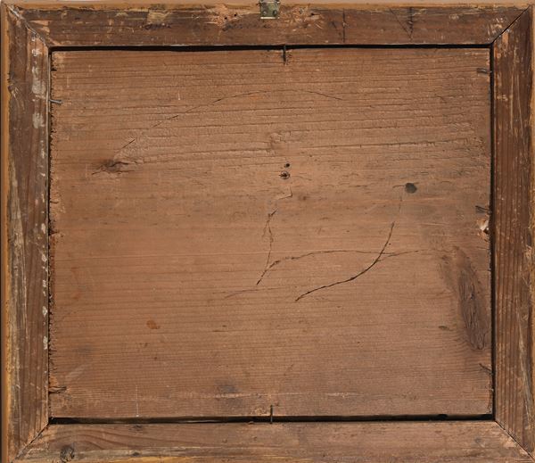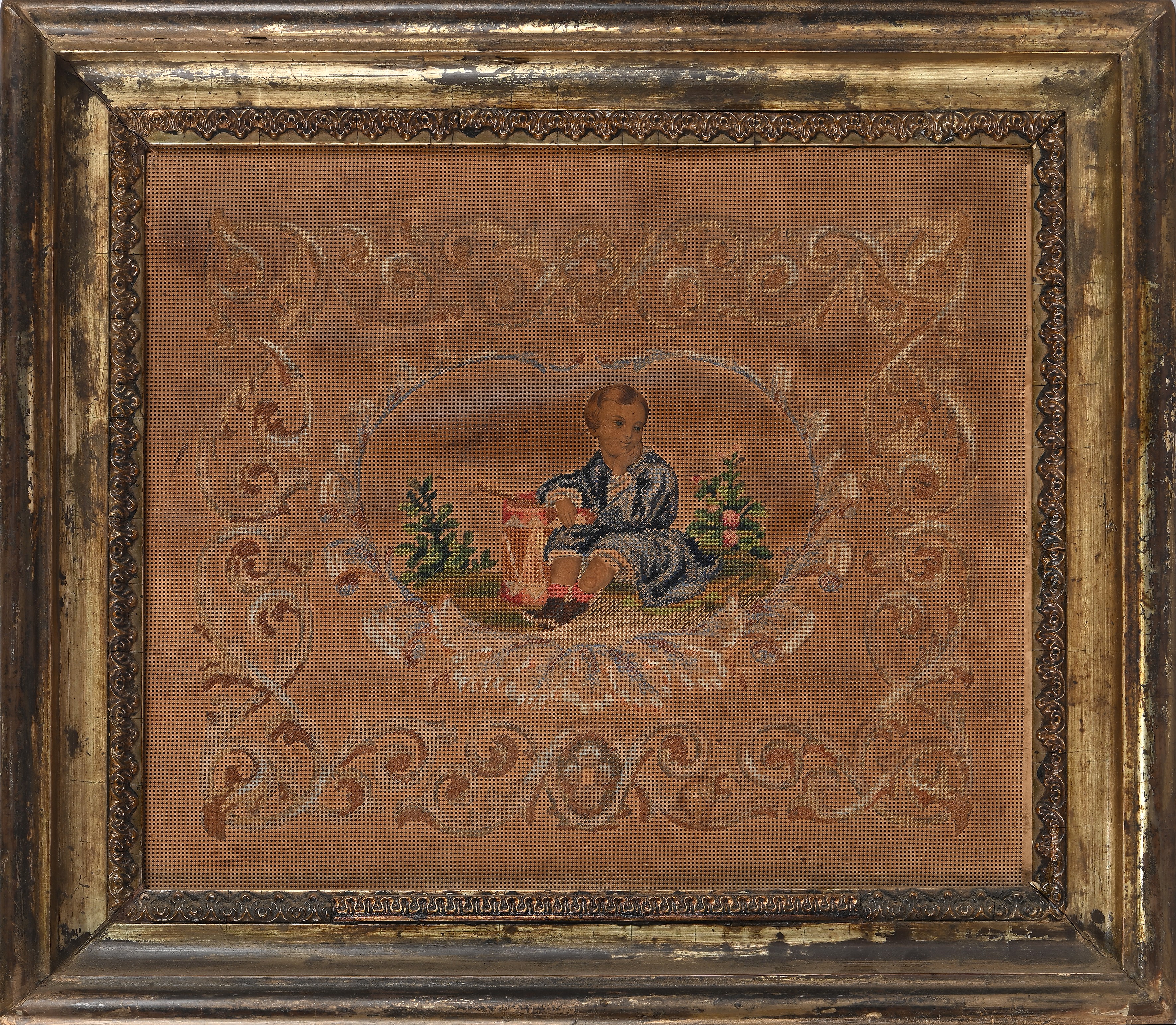 eseguito a mezzo punto su antico canovaccio, raffigurante un bambino con tamburo seduto su zolla erbosa delimitata da cespugli fioriti, racchiuso in una ghirlanda inclusa in un'ampia bordura abbozzata costituita da volute vegetali. Cornice modanata in legno dorato.