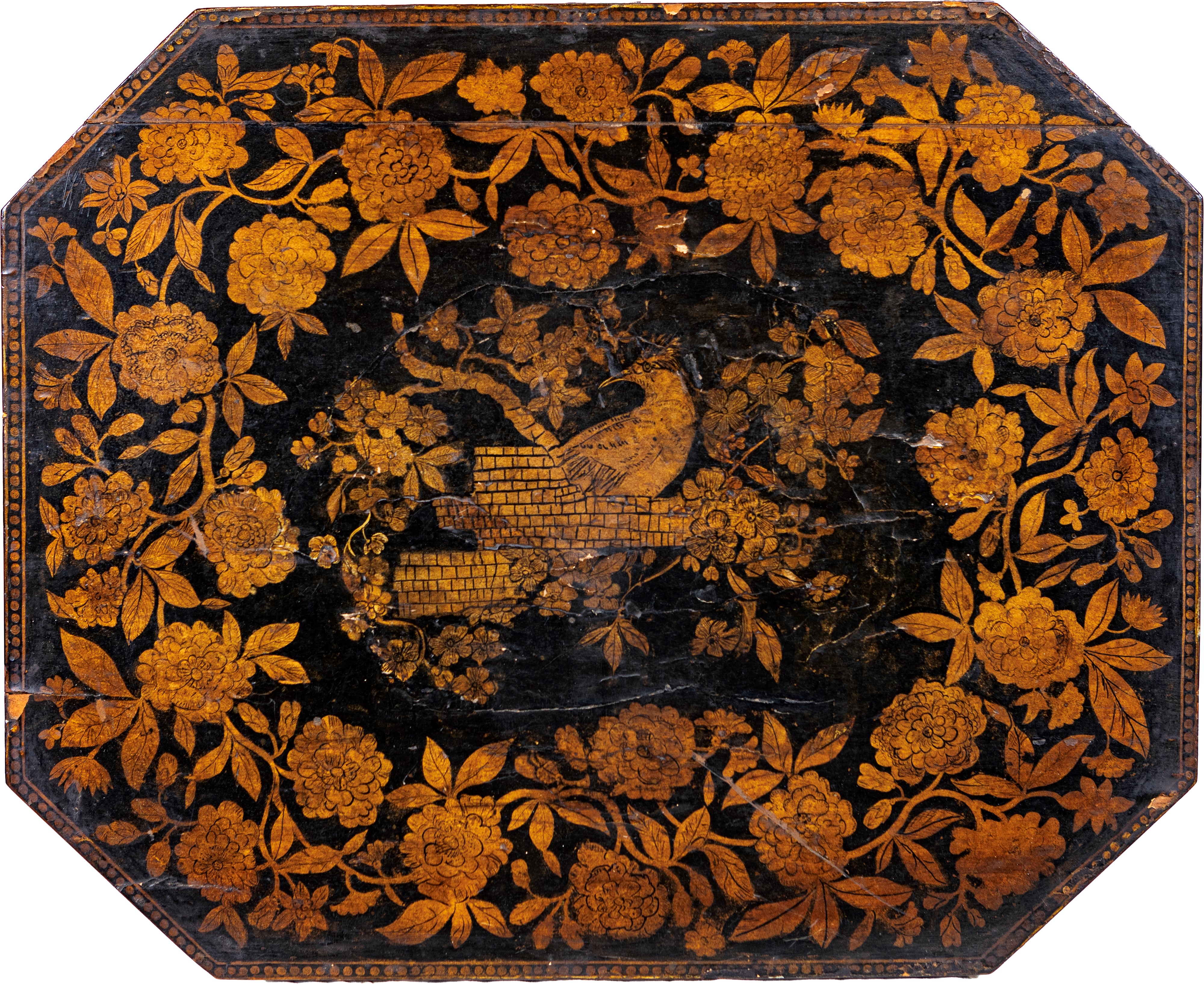 piano rettangolare con spigoli scantonati, decorato da una composizione floreale con figura di volatile incorniciata da tralci di peonie; sostegno a balaustro compostito su tre piedi a sciabola. Lievi mancanze alla lacca