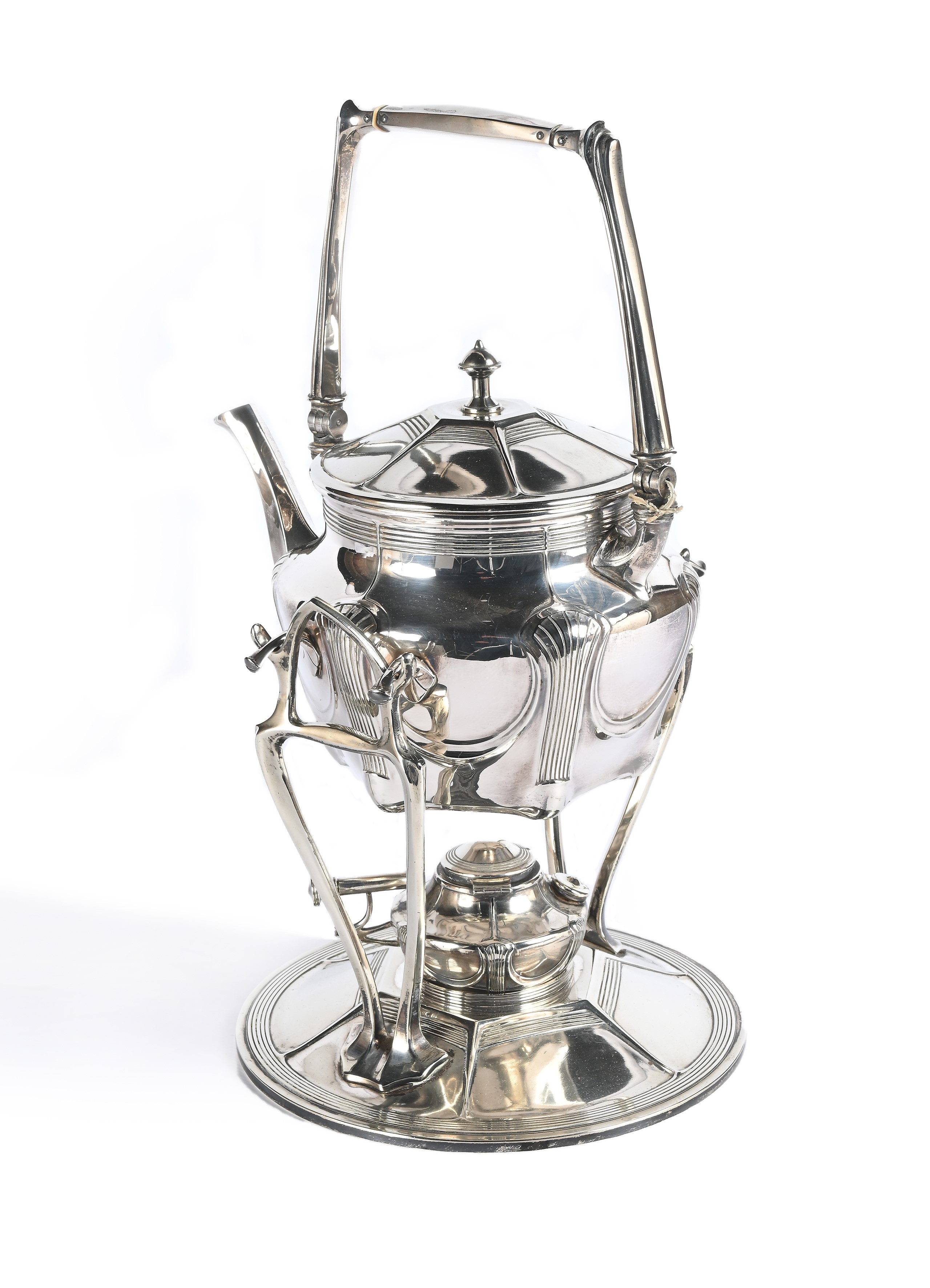 Teiera Jugendstil con rechaud in metallo argentato, Orivit, Germania, primo quarto del XX secolo
