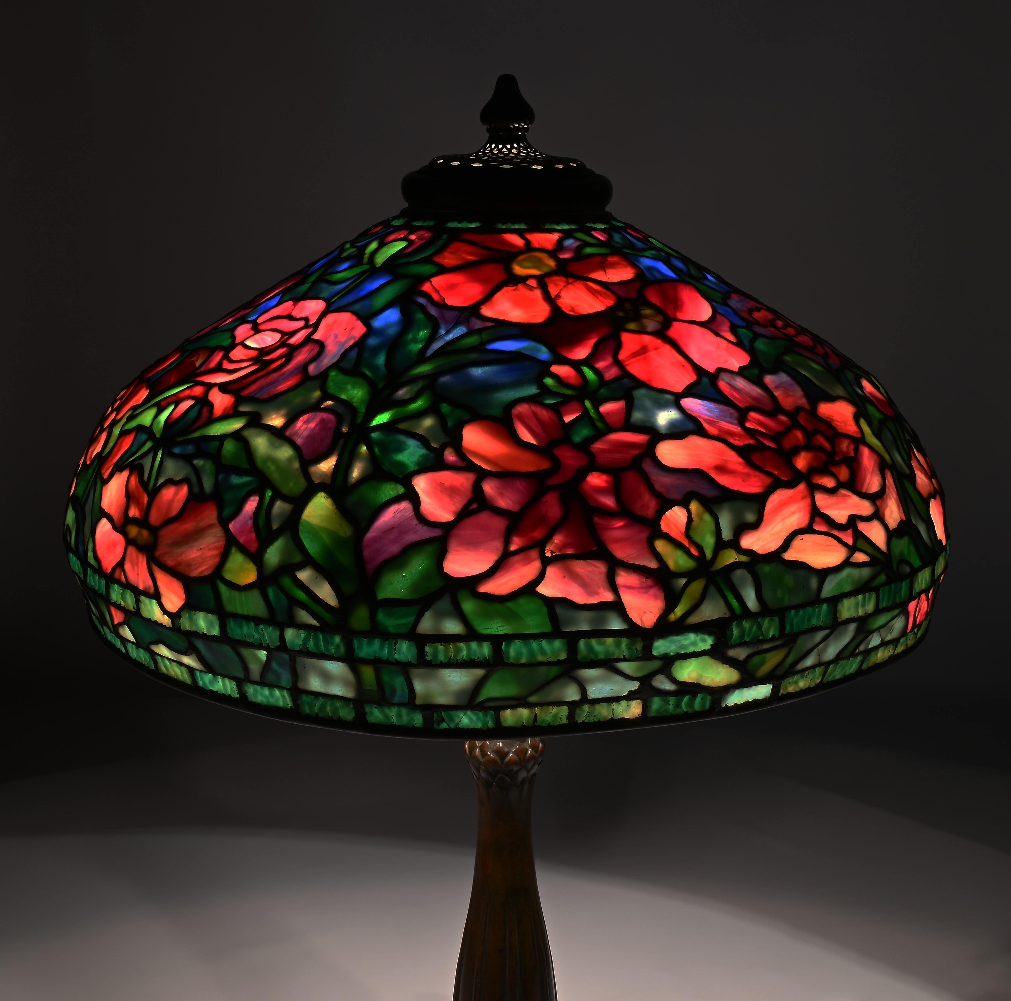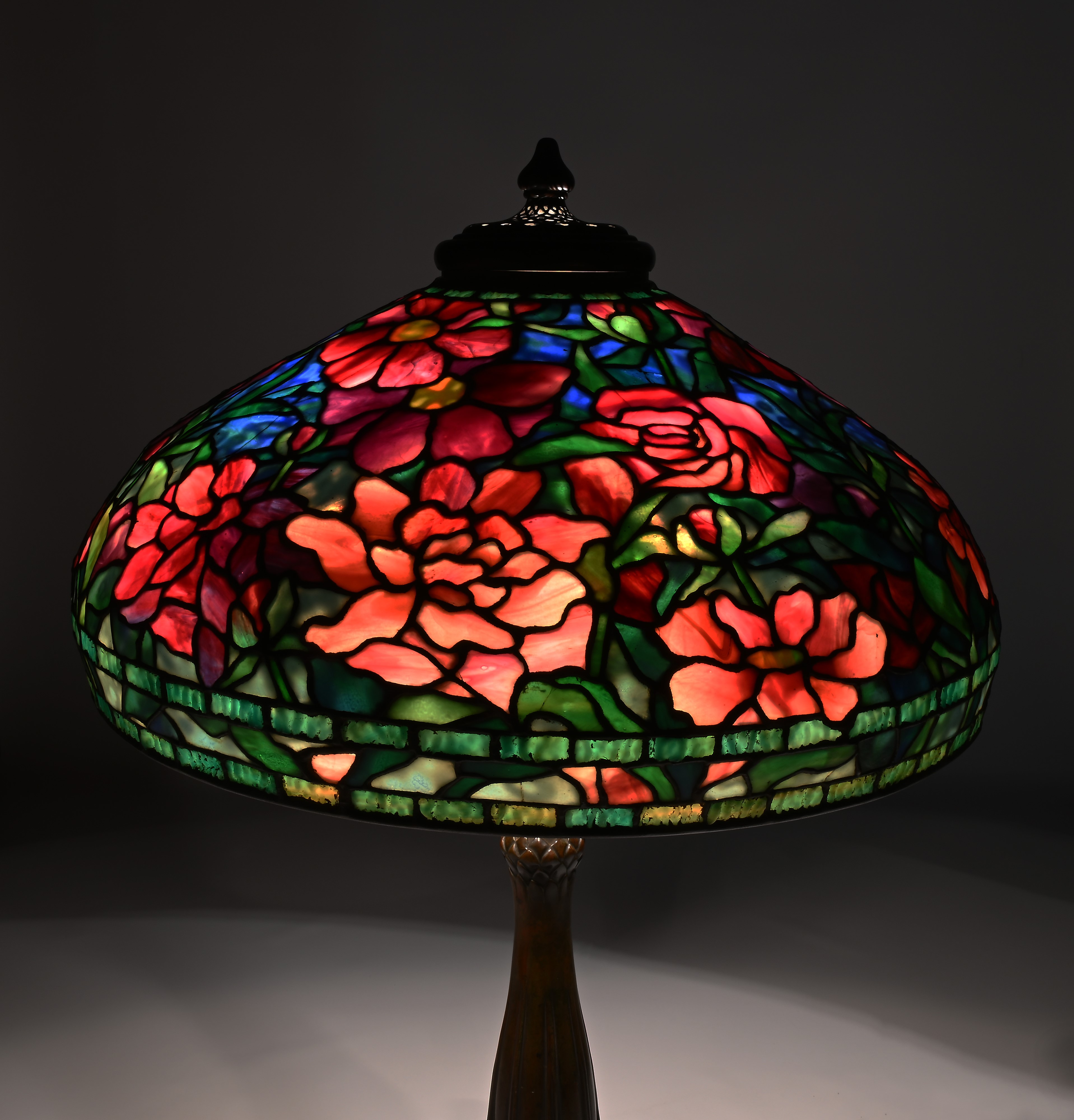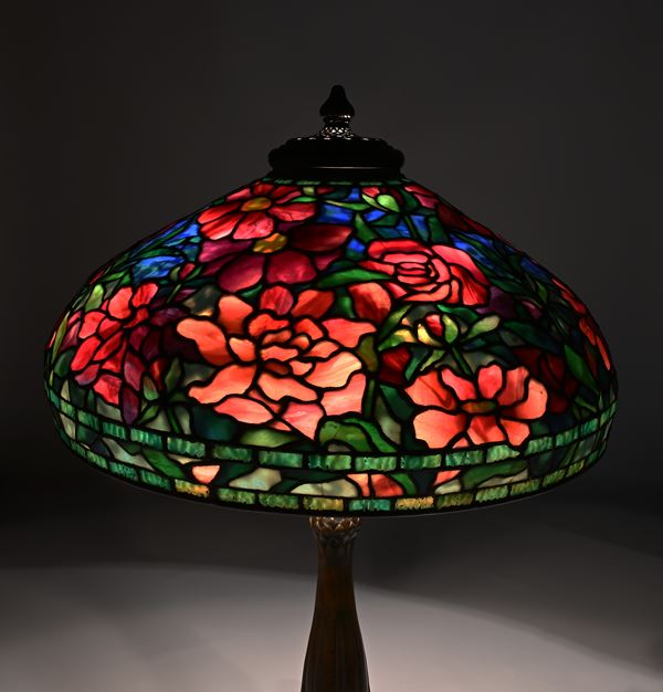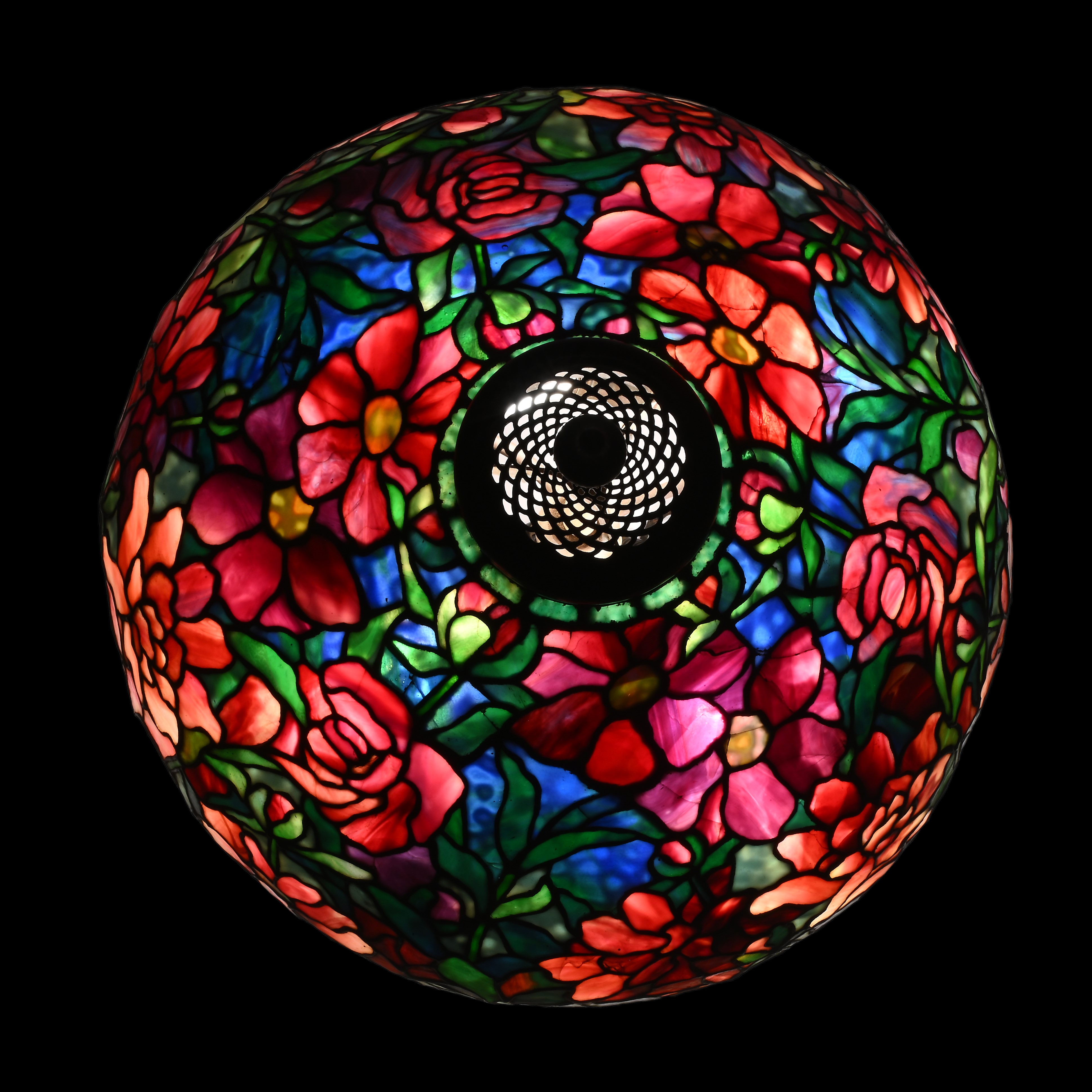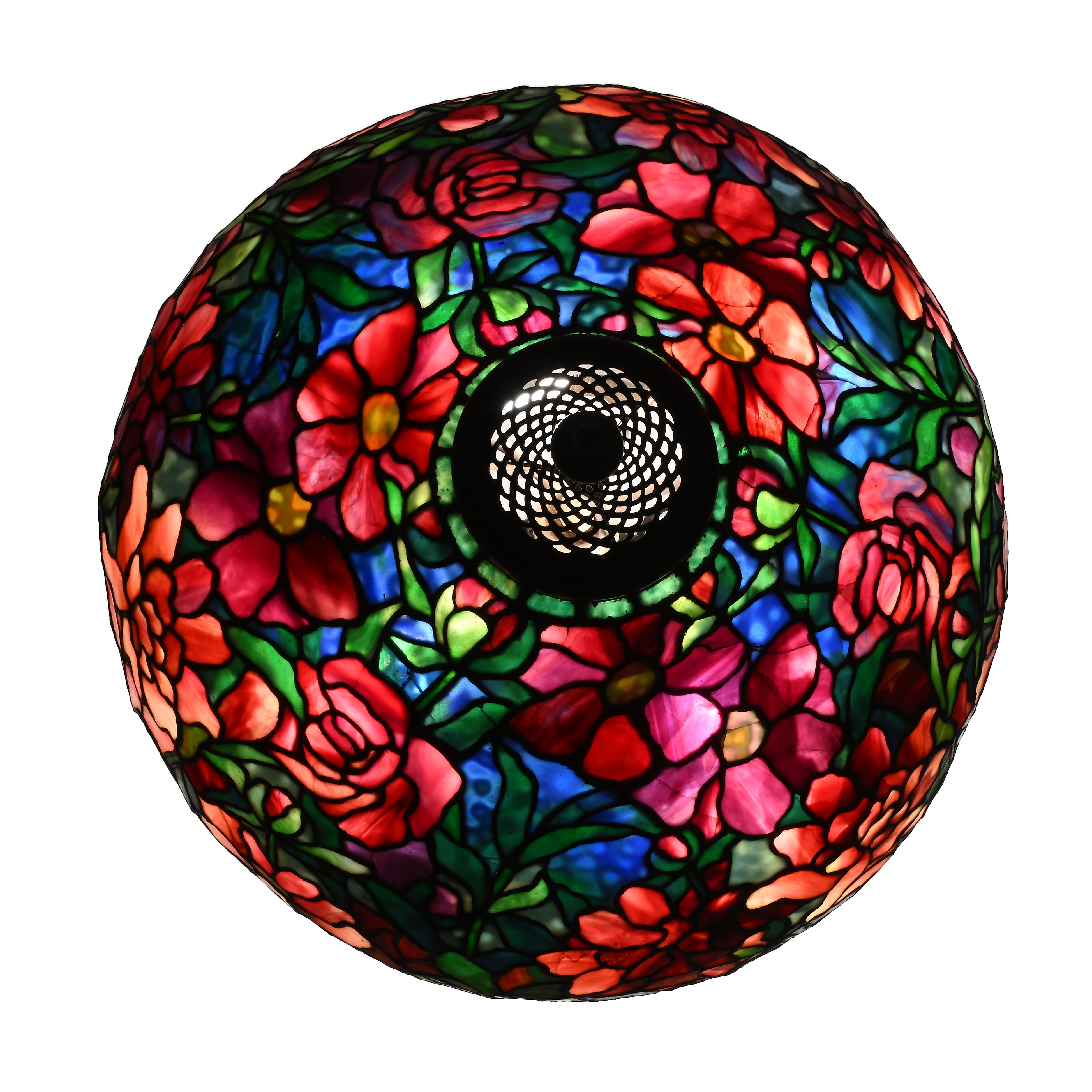 diffusore a cupola di tessere di vetro policromo legate a piombo a decoro floreale; lungo il bordo tessere geometriche verdi si dispongono su due file sovrapponendosi, idealmente, sul fitto disegno naturalistico. Base reticolata in fusione di bronzo a quattro luci. Marchio della manifattura con numero di modello impresso sotto ad un piede "Tiffany Studios New York 397" e lungo il profilo interno del diffusore "Tiffany Studios / New York / 1505".