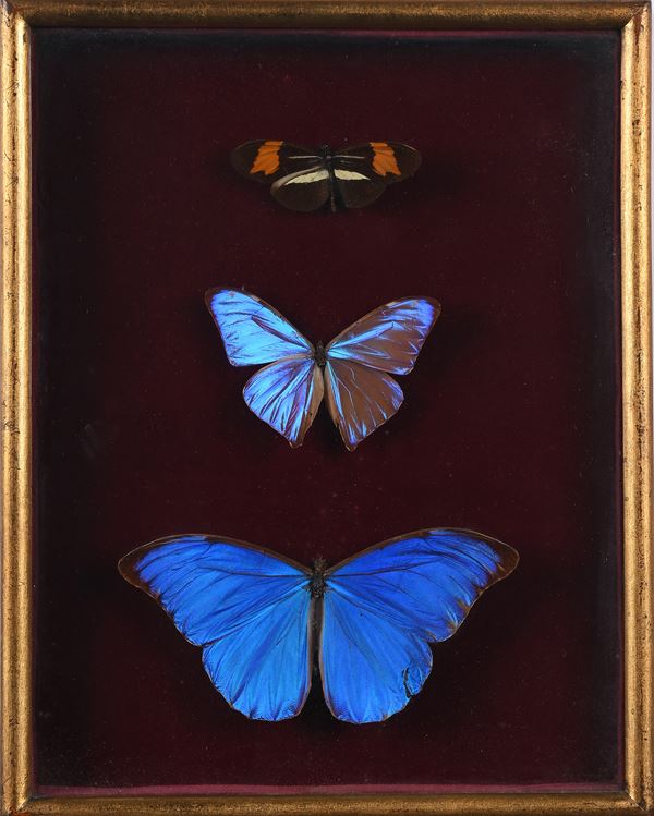 Tre farfalle diverse imbalsamate, entro teca