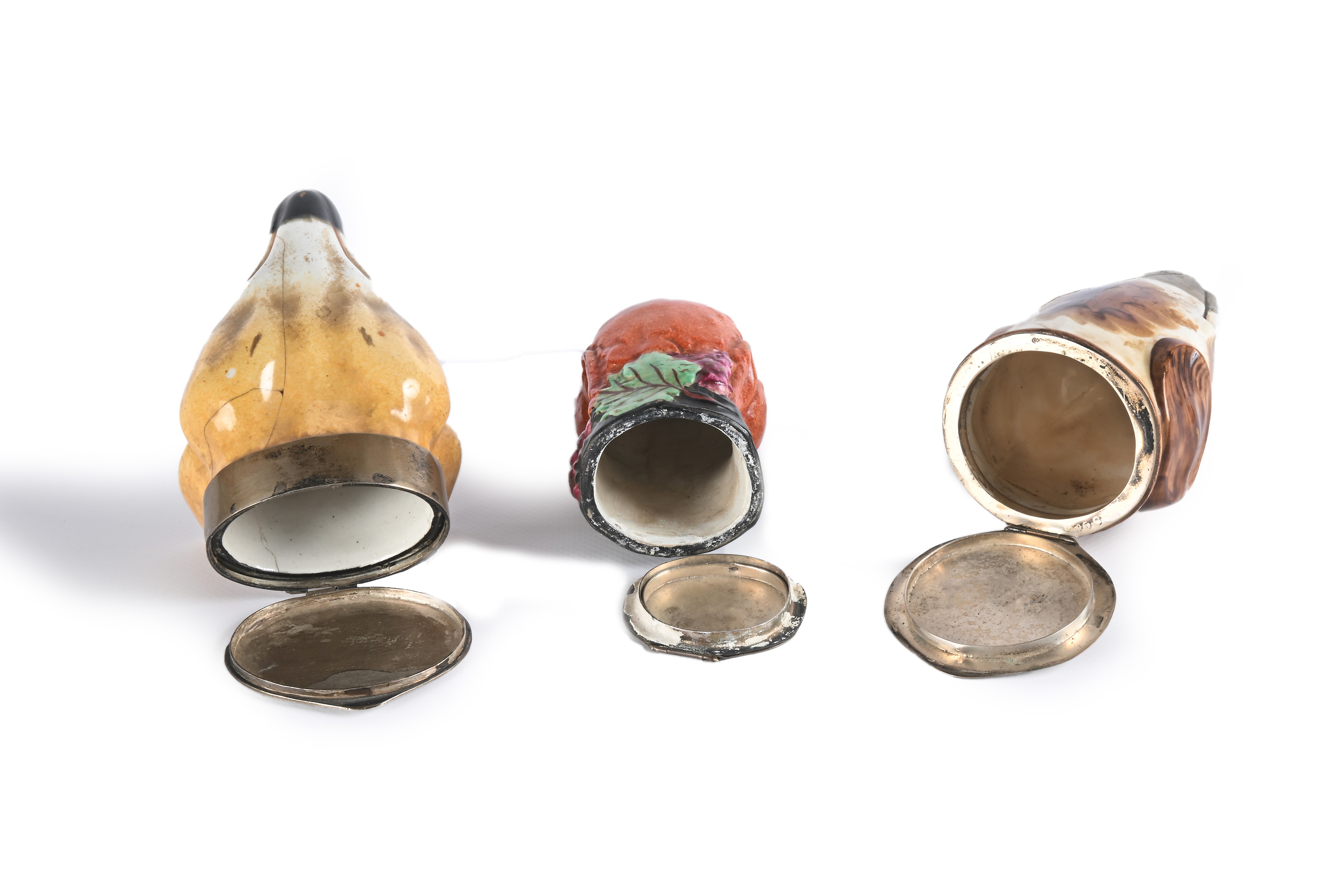 Tre porta polvere zoomorfi in ceramica policroma, Staffordshire, Inghilterra, XIX secolo