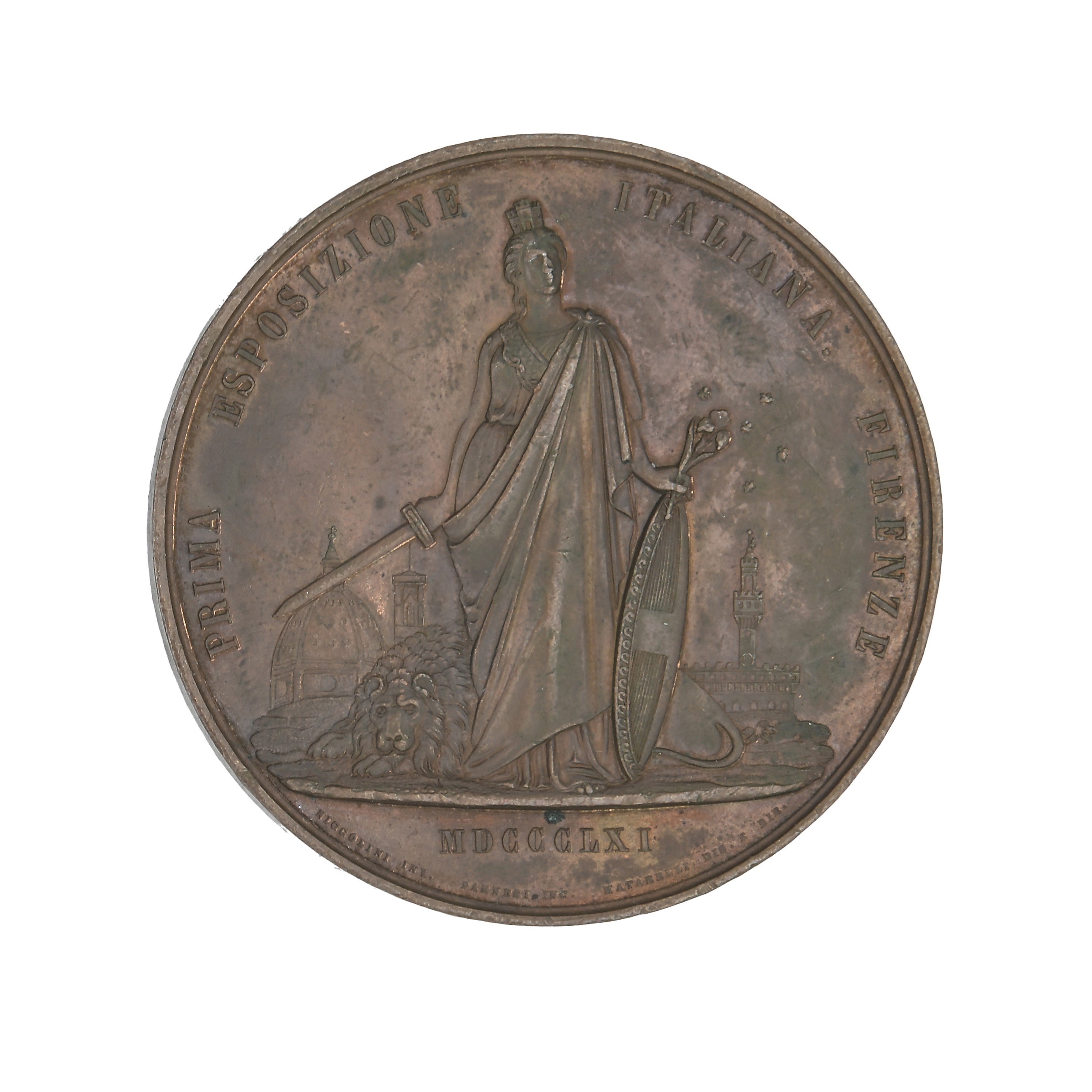 Regno d'Italia Vittorio Emanuele II - Medaglia in bronzo coniata in occasione della Prima Esposizione Italiana di Firenze, datata 1861. D/ Busto del Re contornato da 12 stemmi di città italiane L'ITALIA DEGL'ITALIANI R/ Italia Turrita con spada e scudo Savoia, con Cupola di Santa Maria del Fiore, torre di Giotto e Palazzo Vecchio PRIMA ESPOSIZIONE ITALIANA FIRENZE in esergo MDCCCLXI NICCOLINI INV. FARNESI INC. MATARELLI DIS. E DIR
