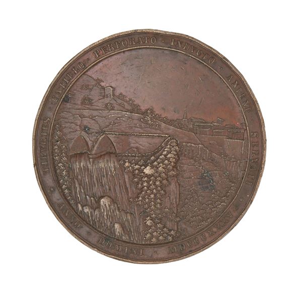 Stato Pontificio - Gregorio XVI - Medaglia Straordinaria in bronzo per ricordare le opere idrauliche svolte per deviare il corso dell'Aniene presso Tivoli, datata 1835 e firmata Heinrich Lorenz D/ L'ingresso dell'Aniene nei nuovi cunicoli di Monte Catillo GREGORIVS•XVI•AVSV•ROMANO•SACRI•PRINCIPATVS•ANNO•II•IVCHOAVIT•V•PERFECIT H. LORENZ•F• R/ L'uscita dell'acqua dai due nuovi cunicoli TIBVRTES•CATILLO•PERFORATO•INDVCTO•ANIENE•SERVATI ANNO•DOMINI•MDCCCXXXV
