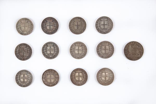 Lotto 12 esemplari da 5 Lire Vittorio Emanuele II e Umberto I Regno d'Italia: 1871 M (2 esemplari); 1872 M; 1876 R (4 esemplari); 1877 R (2 esemplari); 1878 R; 1879; Bir 1889 Menelik II Regno d'Etiopia