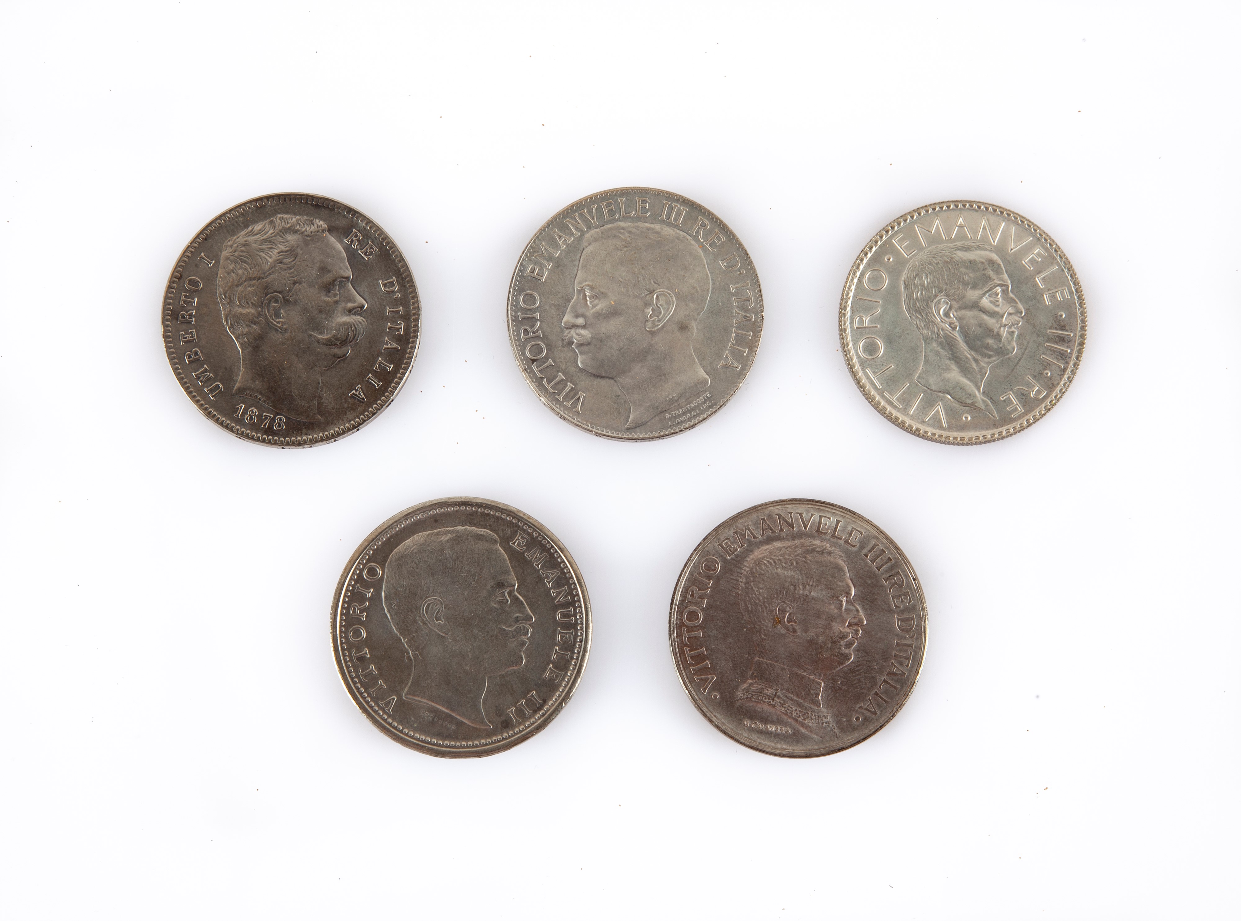 Lotto di 5 riproduzioni di monete del Regno d'Italia Umberto I e Vittorio Emanuele III