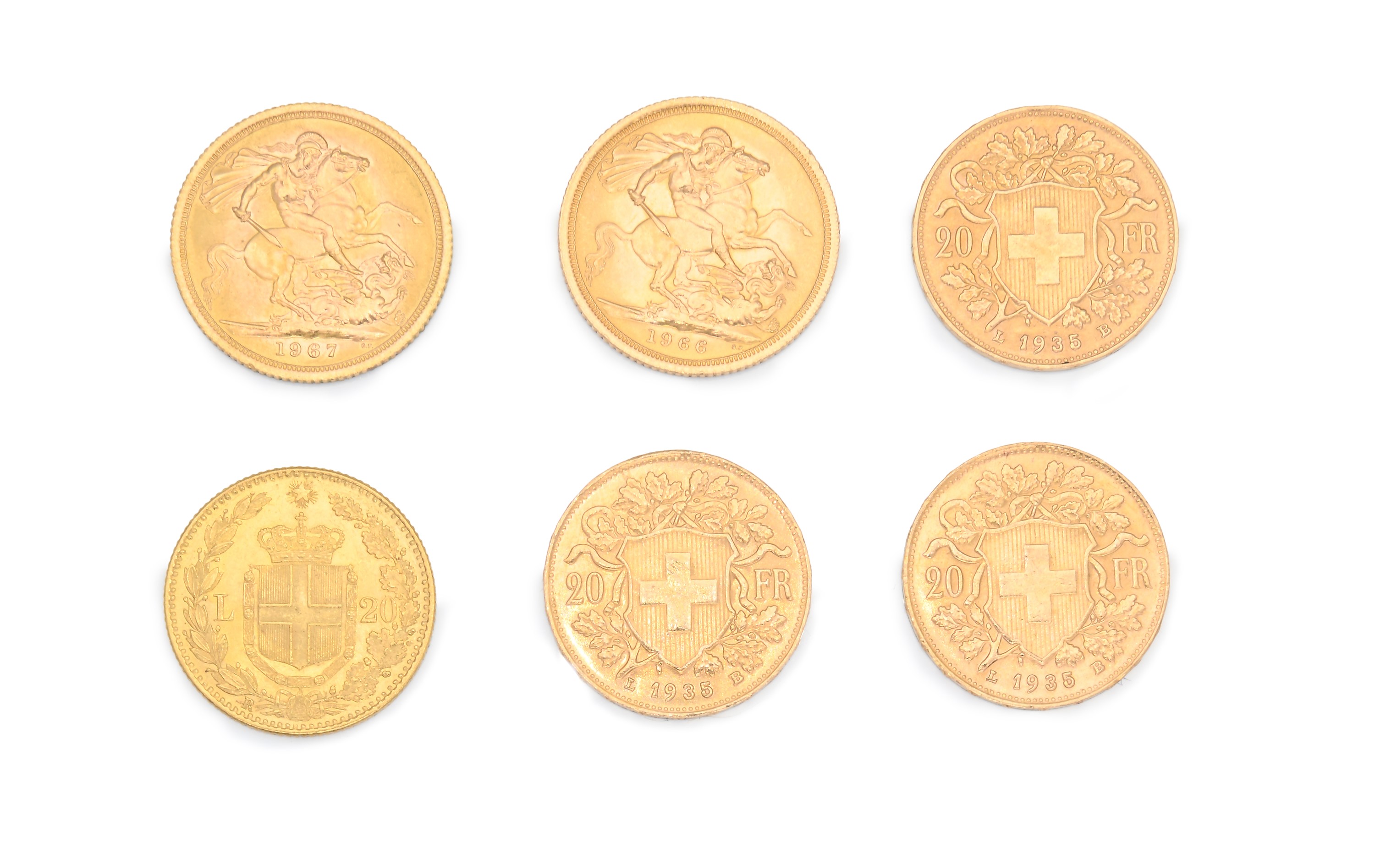 Lotto di 6 monete: 20 lire 1882 Regno d'Italia Umberto I; 3 da 20 franchi 1935 Svizzera; 2 sterline 1966 e 1967 Gran Bretagna Elisabetta II