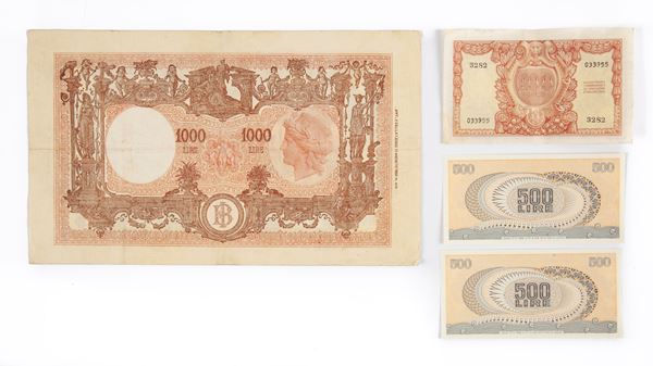 Lotto di Cartamoneta Repubblica Italiana: 1.000 Lire Barbetti Grande M 22 Luglio 1946 Einaudi-Urbini; 100 Lire Italia Elmata 31 Dicembre 1951 Di Cristina; 2 esemplari 500 Lire Biglietto di Stato Aretusa 23/02/1970