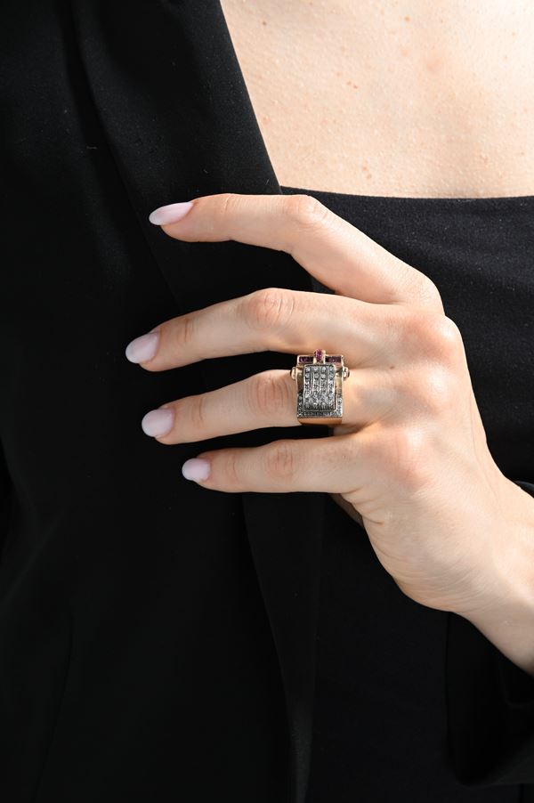 Oro a basso titolo, diamanti in taglio rotondo. Peso complessivo gr. 10,50