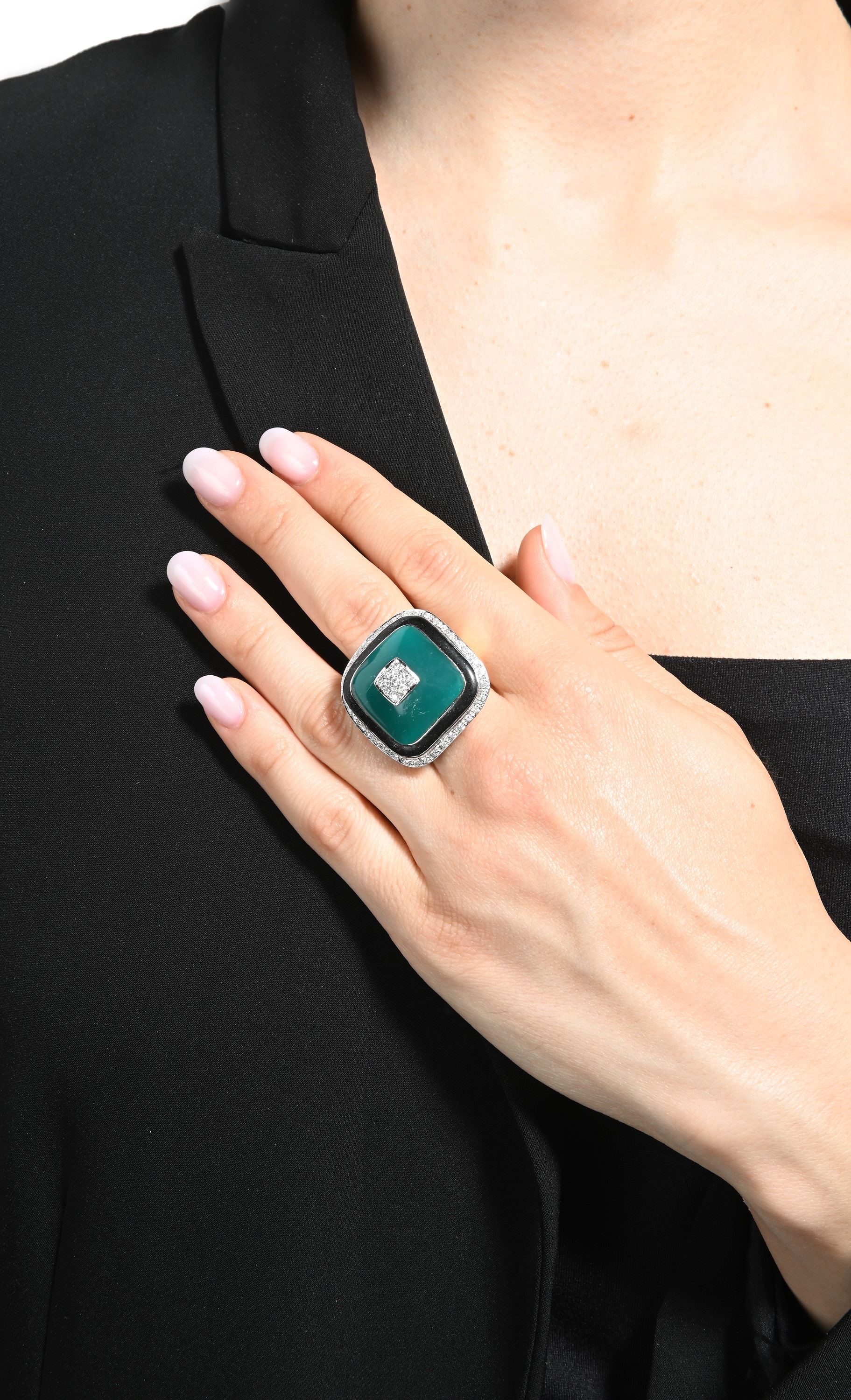 Anello da cocktail in oro, brillanti, onice e agata.