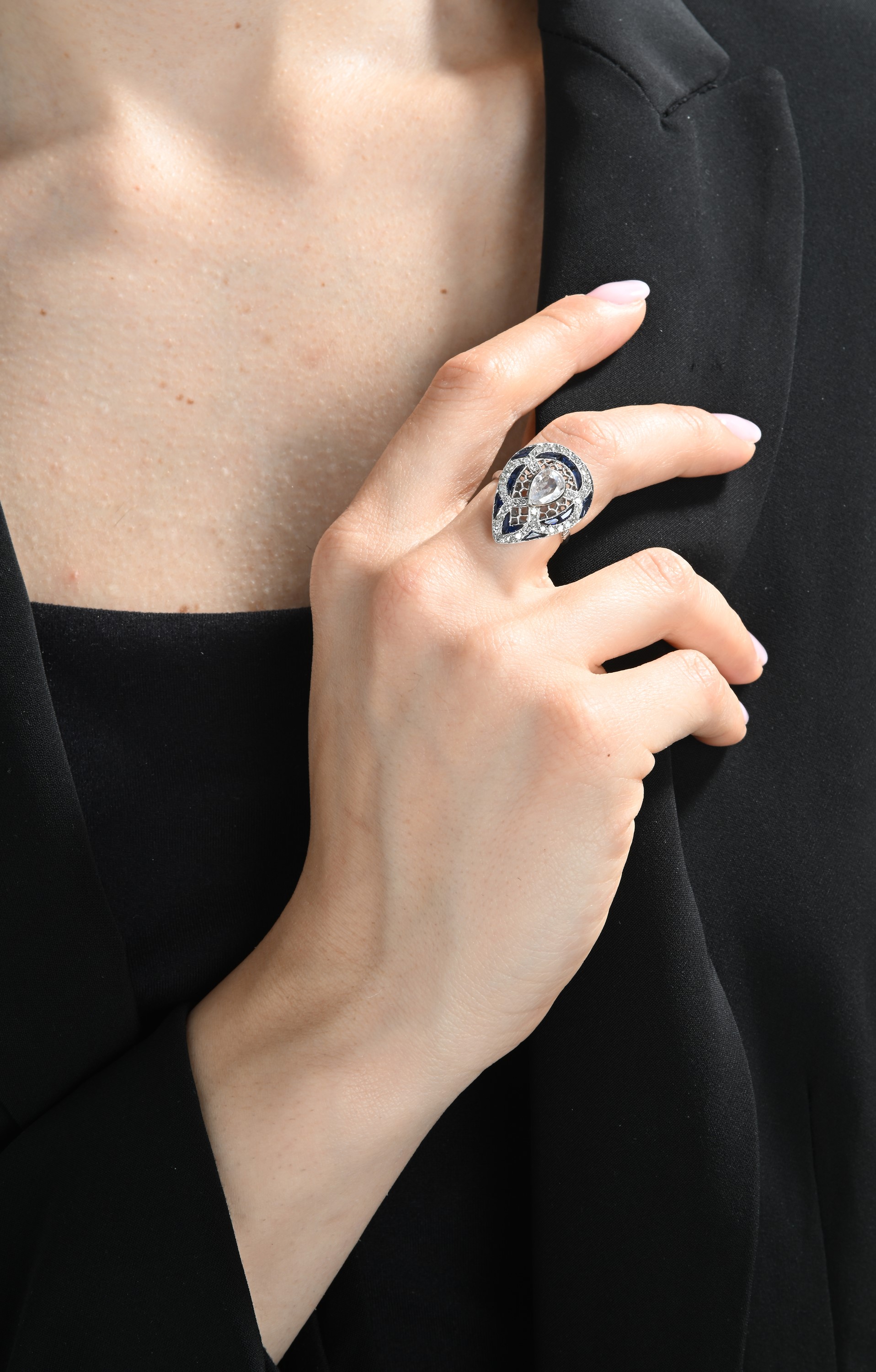 Platino 950/000. Diamanti in taglio rotondo e goccia. Peso complessivo gr. 6,30