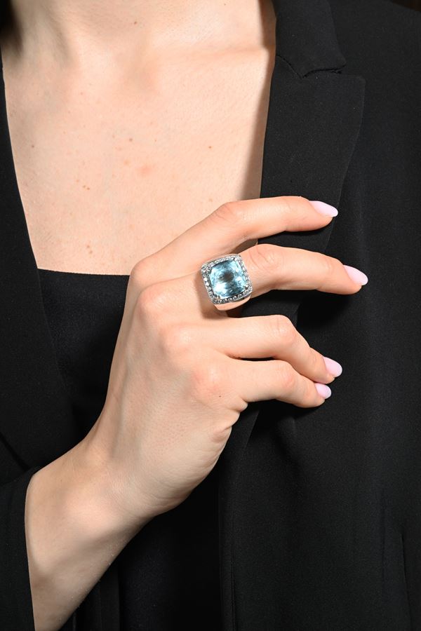 Oro bianco 750/000. Acquamarina in taglio cuscino ct. 13,50 ca., diamanti in taglio rotondo brillanti. ct. 0,65 ca. Peso complessivo gr. 25