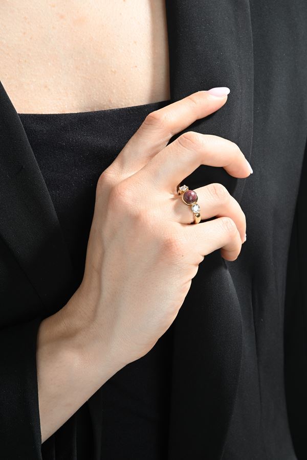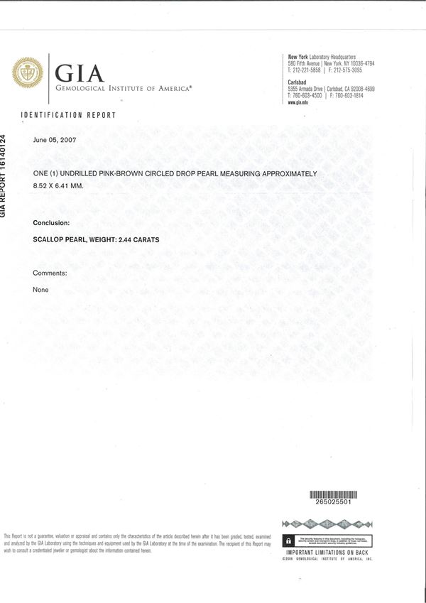 Peso complessivo gr 6,70. Oro giallo 750/000. Perla naturale spontanea Scallop ct 2,44. Due diamanti naturali in taglio rotondo brillante ct 0,40 ca. F-G, VVS1. Corredato da certificazione gemmologica GIA n° 16140124