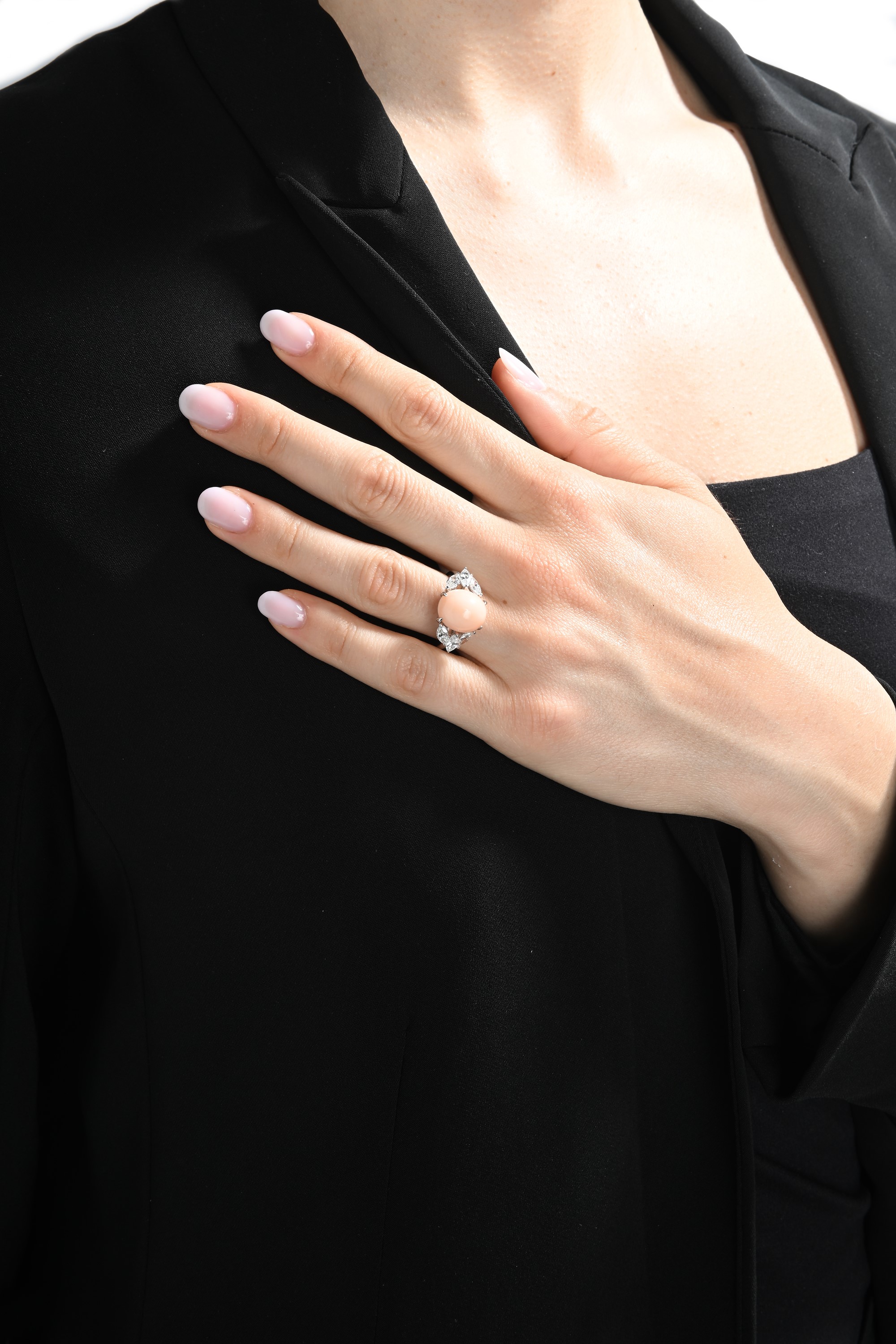 Anello in oro, corallo pelle d'angelo e diamanti in taglio navette