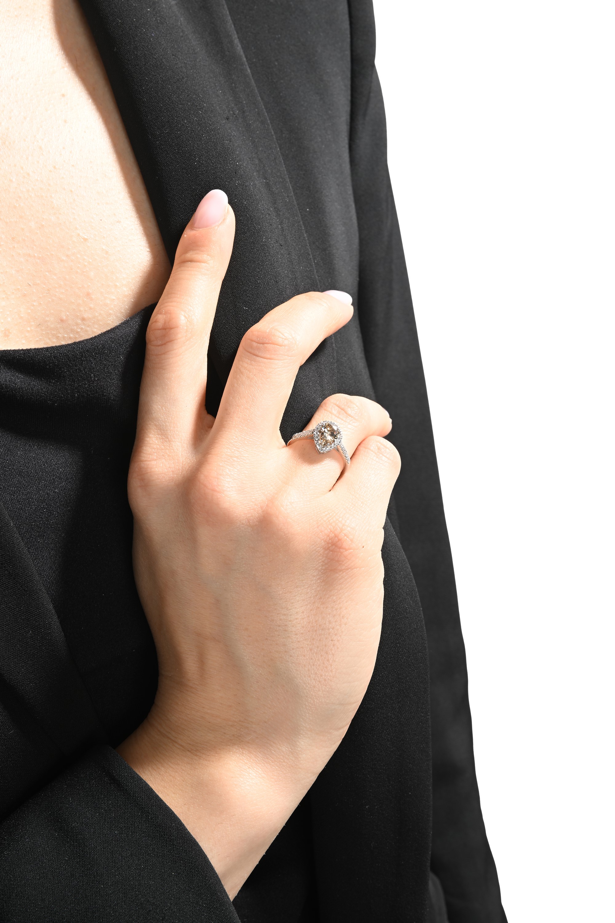 Oro bianco 750/000. Diamante Fancy color in taglio goccia ct. 1 ca. Diamanti in taglio rotondo brillante ct. 0,35 ca. Peso complessivo gr. 3,30.