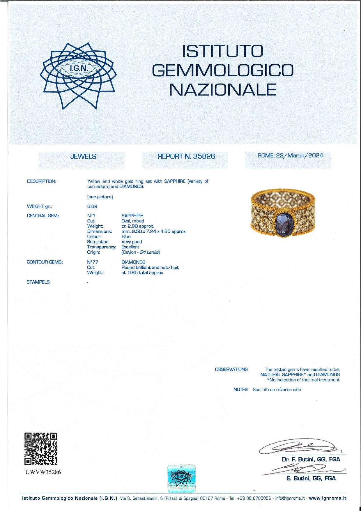 Oro bianco e giallo 750/000. Diamanti in taglio rotondo brillante e huit huit ct. 0,85 ca. Zaffiro naturale in taglio ovale ct 2,90 Sri Lanka (Ceylon), SENZA INDICAZIONE DI TRATTAMENTO TERMICO. Corredato di certificazione gemmologica. Peso complessivo gr. 6,70.