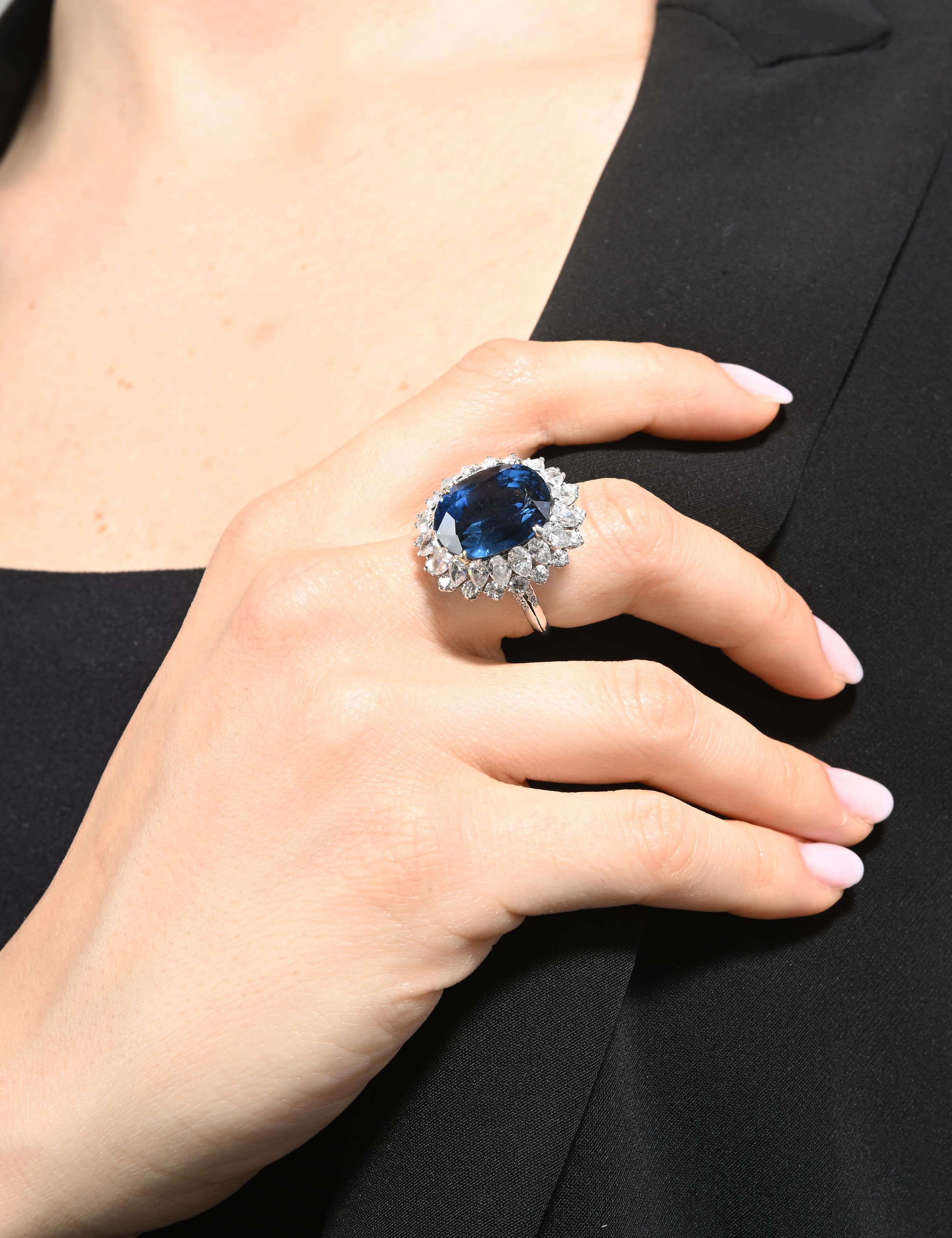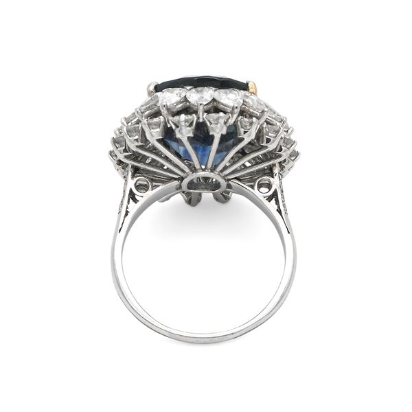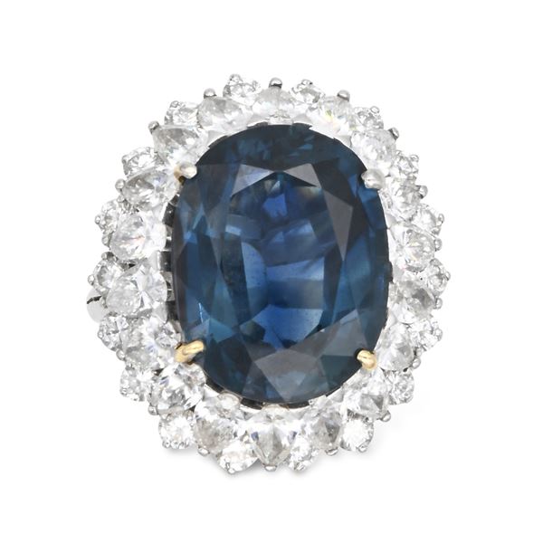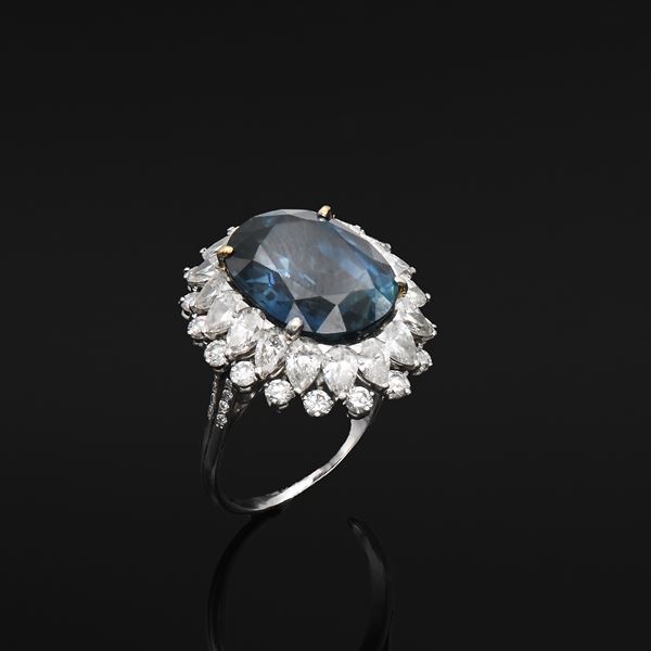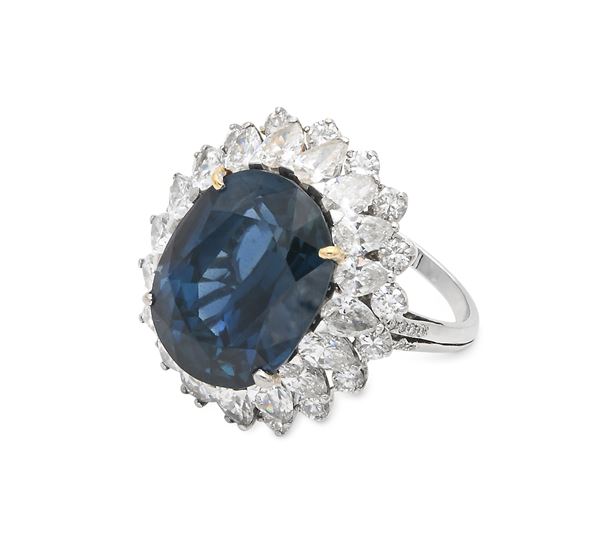 Platino 950/000. Zaffiro naturale NO HEAT in taglio ovale ct. 15, diamanti in taglio rotondo brillante e goccia ct. 3,50, G-I, VVS-VS. Peso complessivo gr. 13,50. Corredato di certificazione gemmologica IGN n° 35361