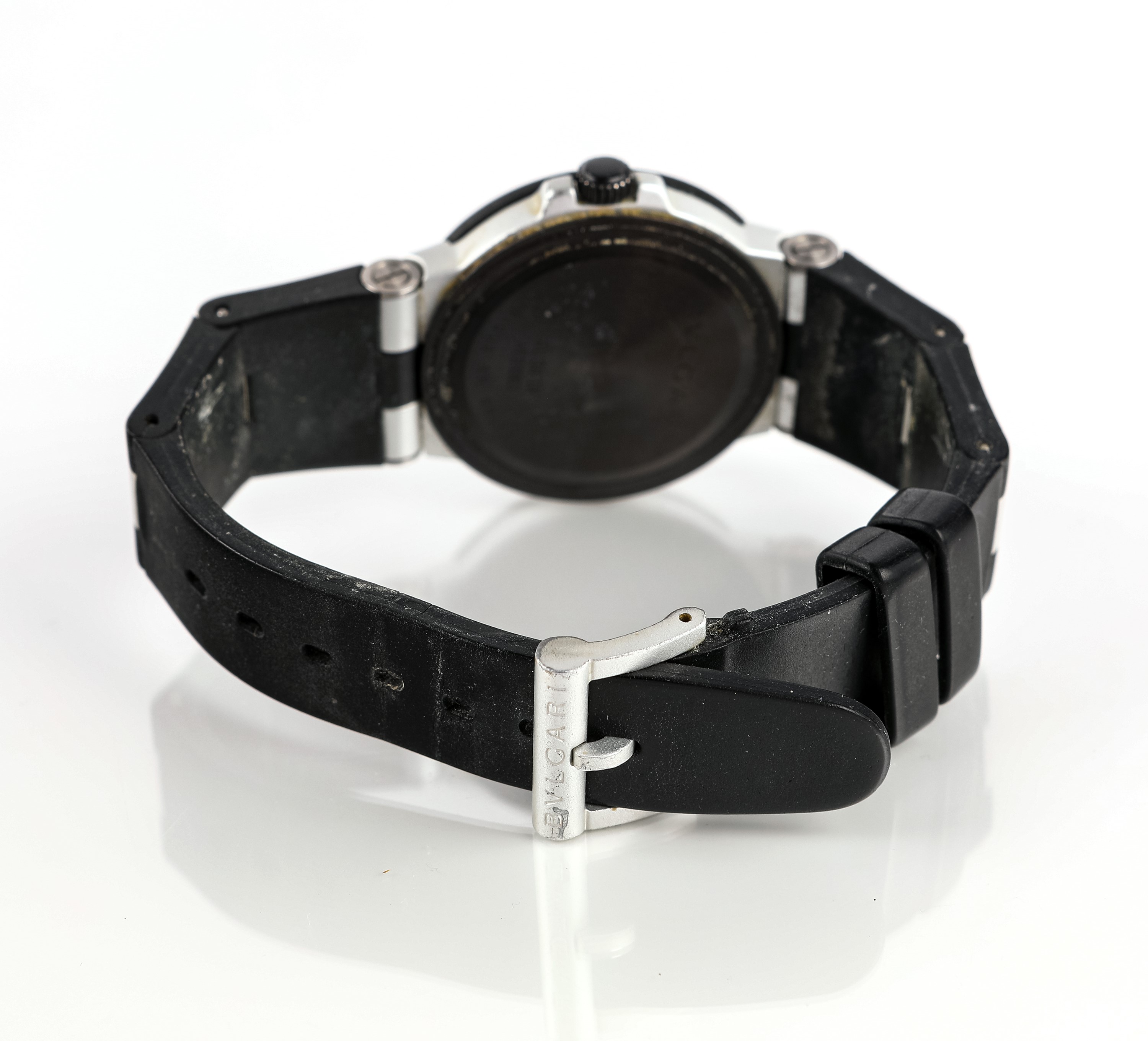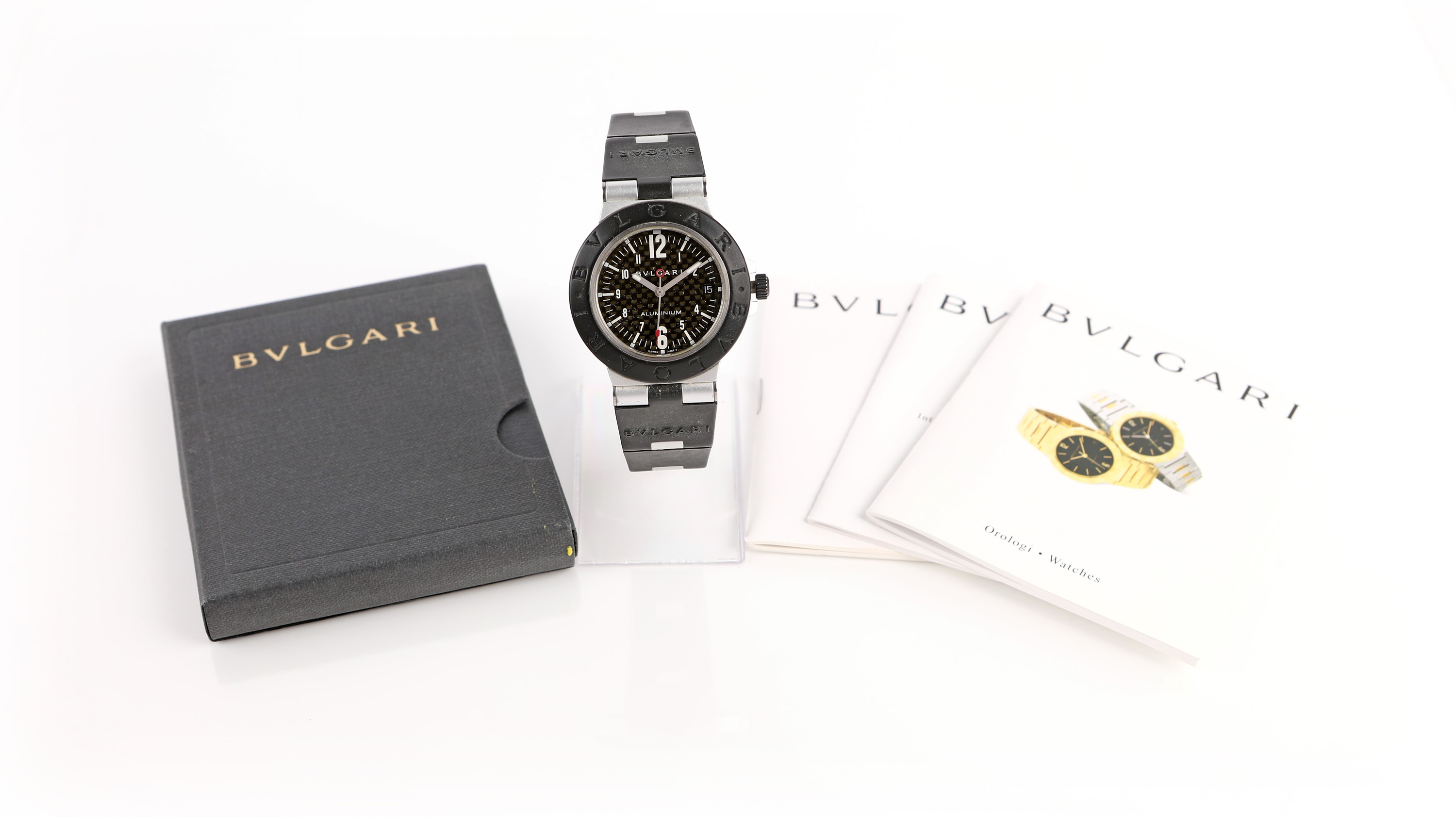 Alluminio e caucciù. Ref. AL 38 TA. Lunetta nera con logo Bulgari. Fondello a scatto, cinturino in caucciù nero. Quadrante nero, numeri arabi, data, lancette Index, secondi al centro. Movimento a carica automatica. Accessori: libretto