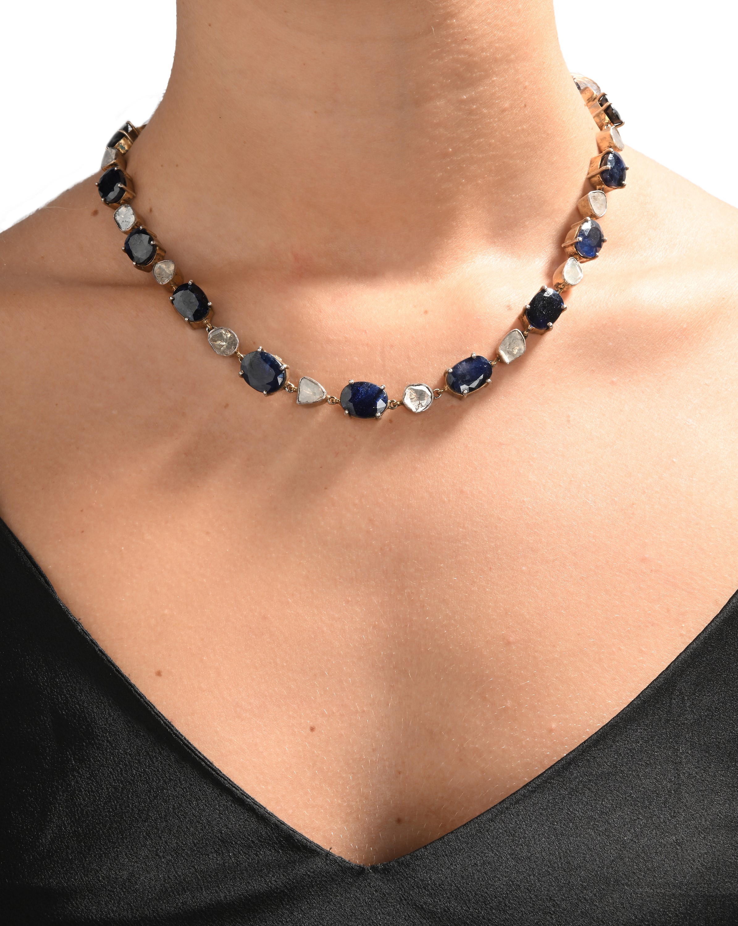 Argento 800/000, metallo, diamanti in taglio rosa incastonati a notte, ct. 3 ca, zaffiri australiani, ct. 45 ca.