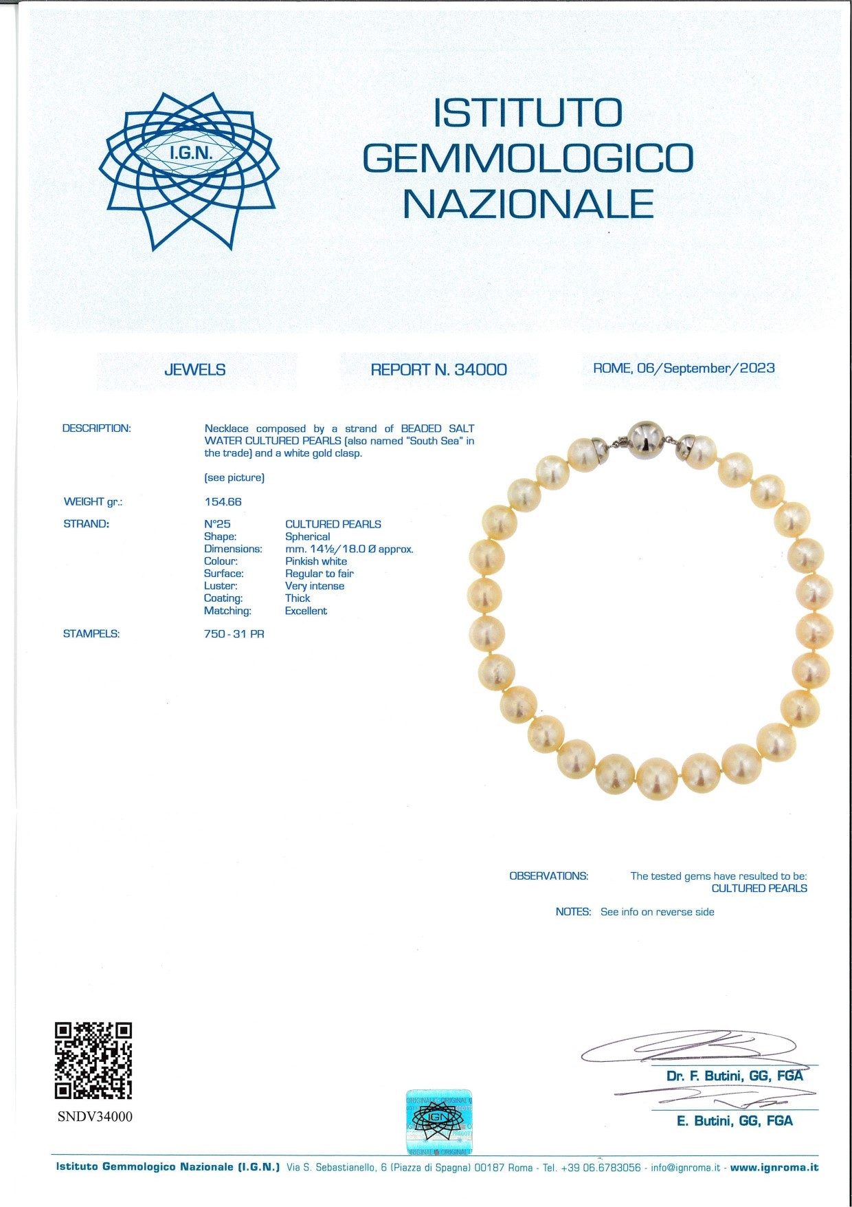 Oro bianco 750/000. Perle da coltivazione in acqua marina, South Sea, sferiche, del diametro da mm. 14 1/2 a mm. 18. Peso complessivo gr. 154,60. Corredata di certificazione gemmologica IGN n°34000