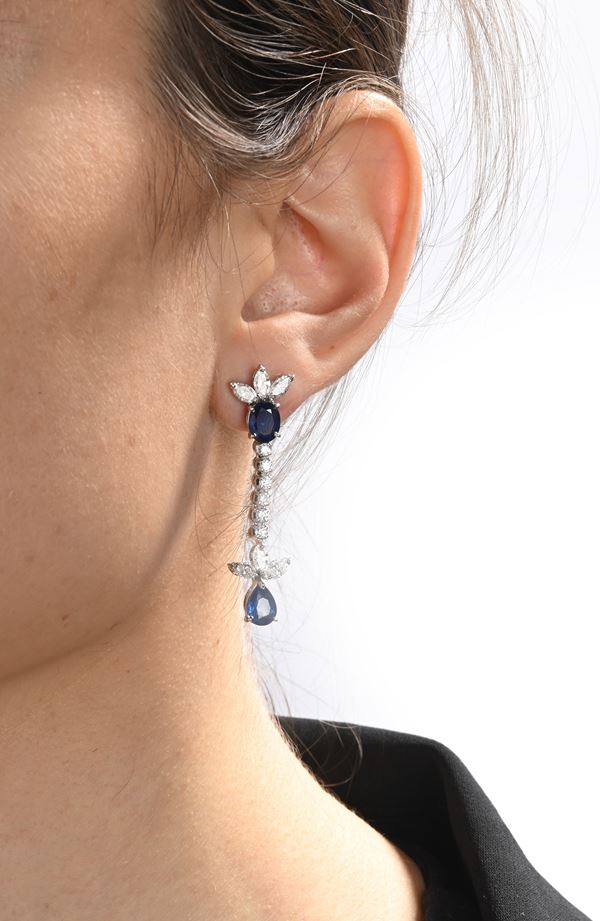 Coppia di orecchini pendenti in oro, brillanti e zaffiri