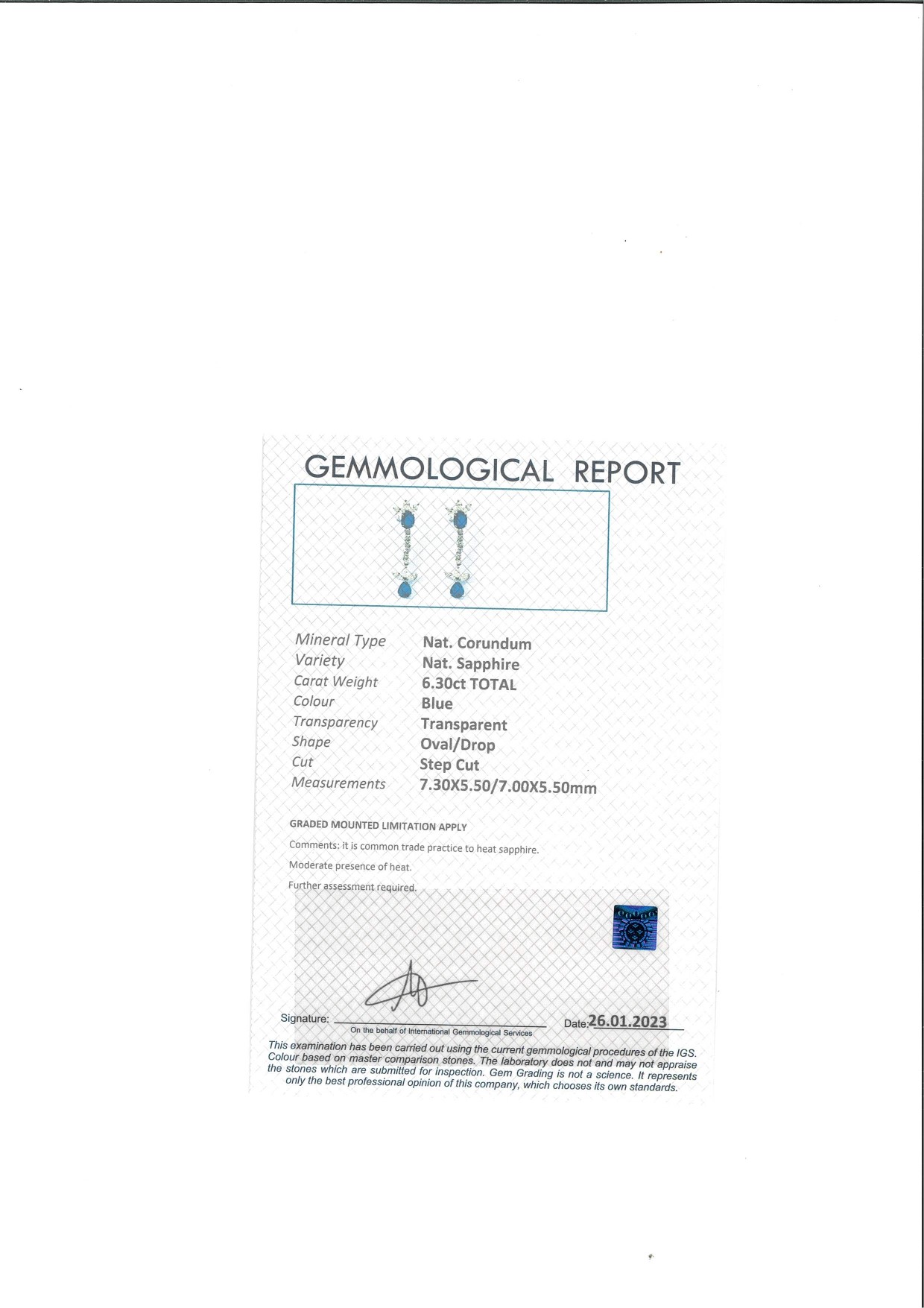 Oro bianco 750/000. Diamanti in taglio rotondo brillante e navette ct. 3,50, G_H, VS-SI. Zaffiri naturali in taglio ovale e goccia ct. 6,30. Peso complessivo gr. 9,10. Corredato di certificazione gemmologica.