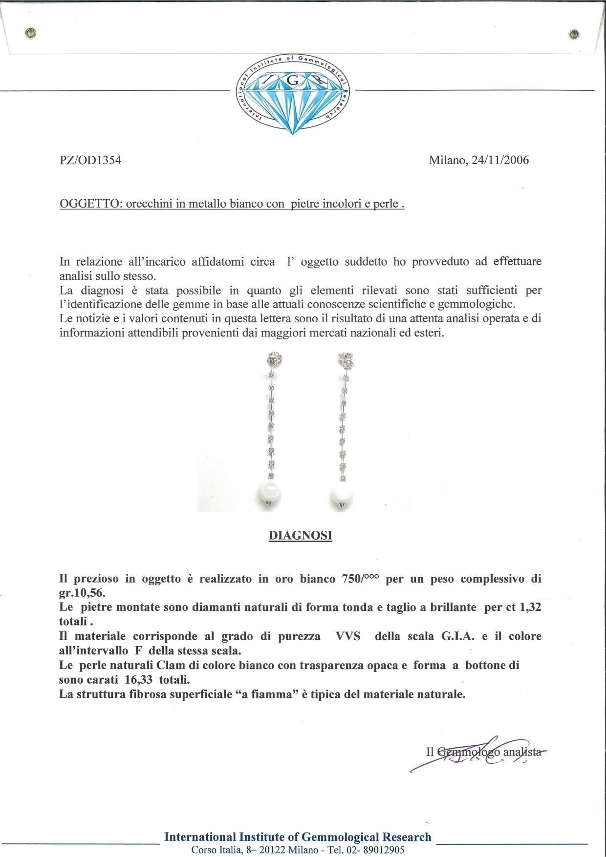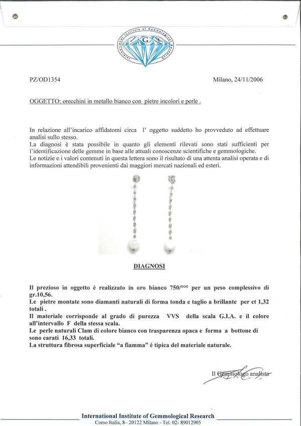 Oro bianco 750/000. Perle naturali spontanee Calm ct. 16,33. Diamanti in taglio rotondo brillanti ct. 1,32 , F, VVS. Peso complessivo gr 10,60. Corredato di certificazione gemmologica IGR n° 1354