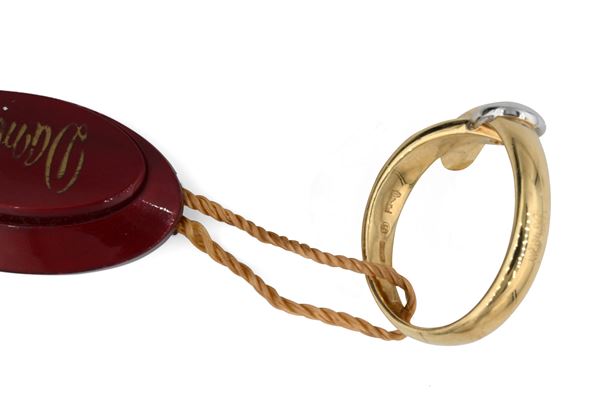 Oro giallo e bianco 750/000. Diamante in taglio rotondo brillante ct. 0,21, F-G,VVS, iscrizione interna della caratura. Peso complessivo gr. 4,80
