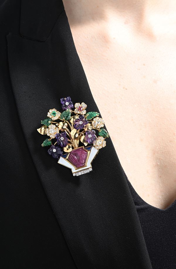 Fusari, spilla a vaso in oro, brillanti, smeraldi, rubini, ametiste e smalto