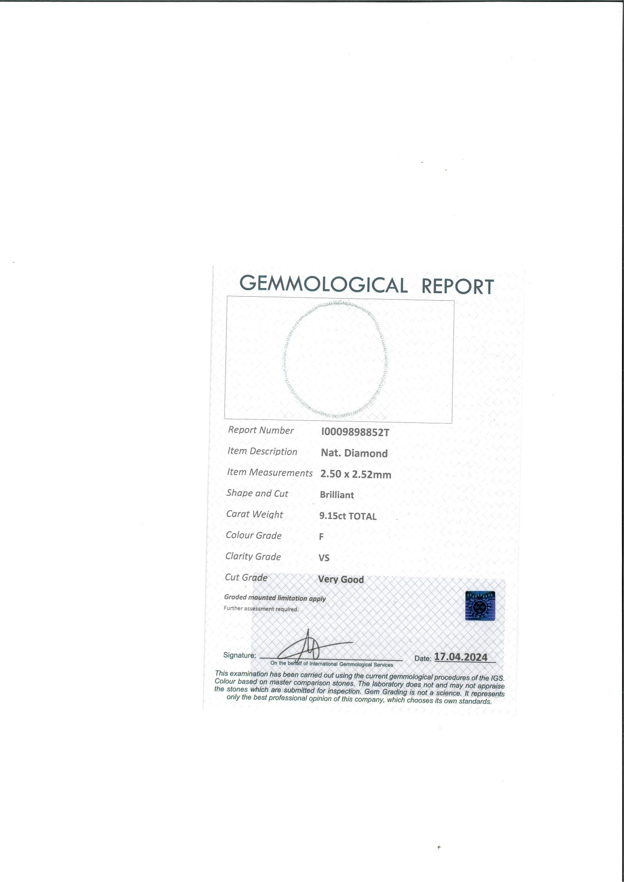 Oro bianco 750/000. Diamanti in taglio rotondo brillante ct. 9,15, F, VS. Peso complessivo gr. 20,30. Corredato di certificazione gemmologica.