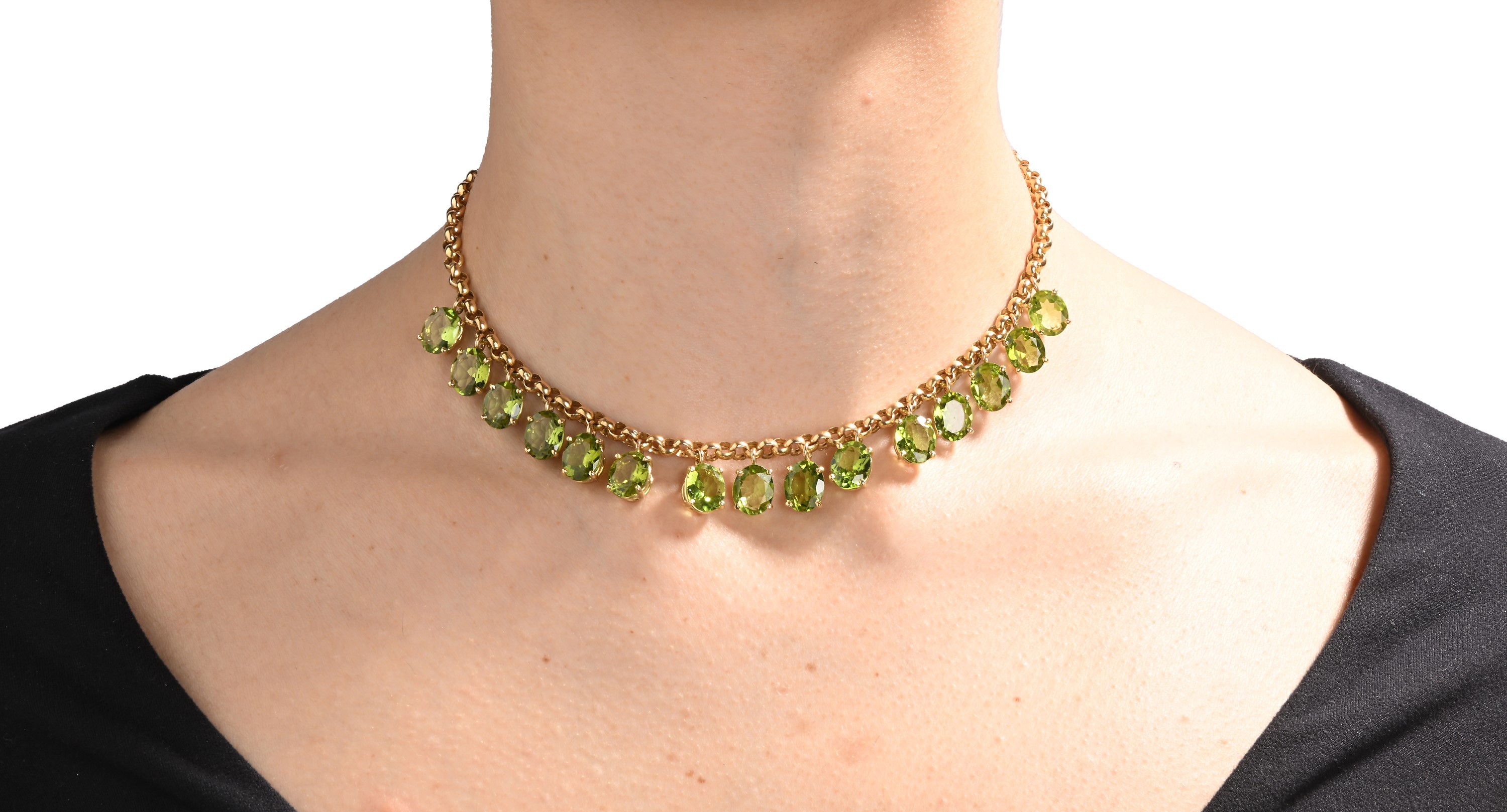 Oro giallo 750/000. Peridoti in taglio ovale ct. 45 ca. Peso complessivo gr. 32,30