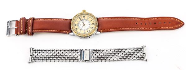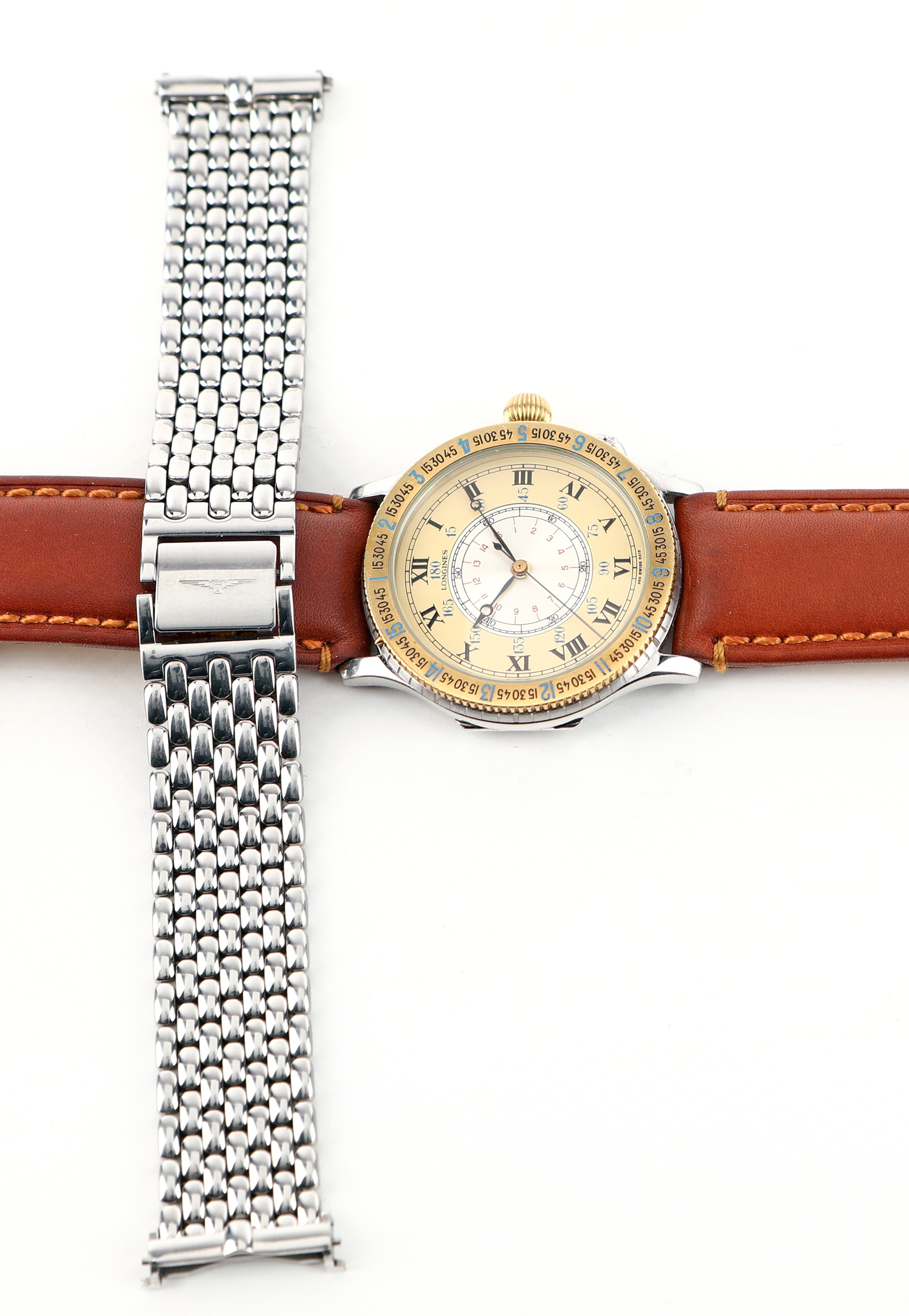 Acciaio e oro. Angolo orario. Fondello a cerniera e secondo con vetro zaffiro. Ghiera in oro bidirezionale graduata, quadrante dorato, numeri romani, disco centrale girevole argentato, lancette Breguet, secondi al centro. Movimento a carica automatica, cal. L. 9892, rodiato, 25 rubini, bilanciere monometalico, spirale piana. Accessori: cinturino Longines in acciaio.