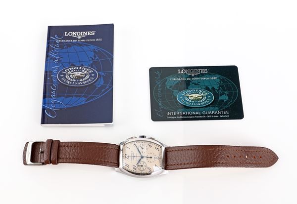 Acciaio. Ref. L2.643.4. Cassa n°31802733. Fondello a vite. Quadrante argentato flinquè, numeri ararbi, data, quadrantini dei secondi e del sommatore dei minuti e delle ore, lancette a foglia, secondi al centro. Movimento a carica automatica. Accessori: garanzia