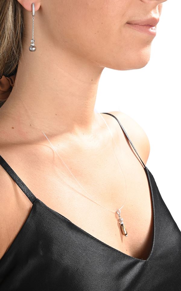 Parure di pendente e coppia di orecchini in oro, brillanti e perle naturali spontanee