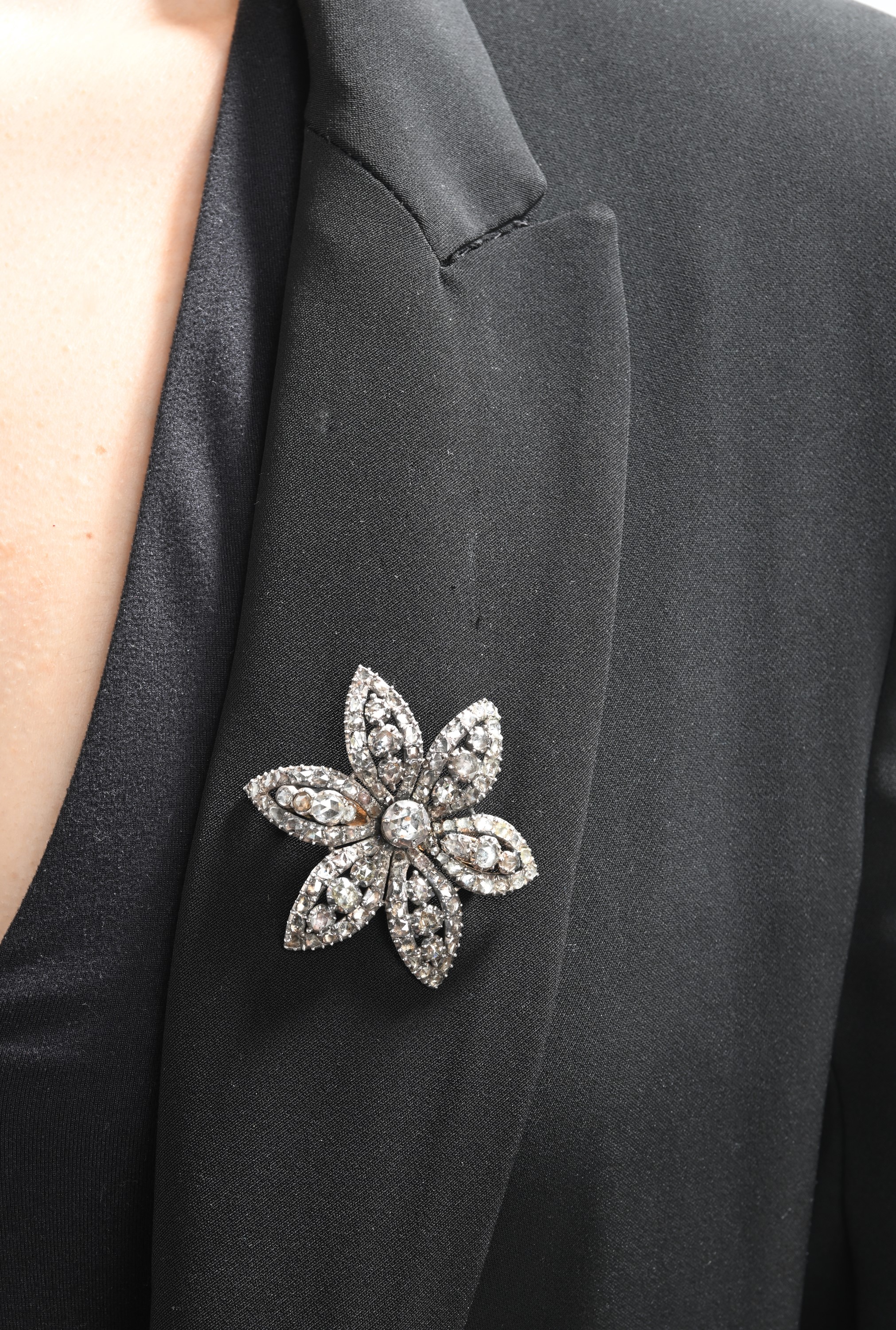 Spilla antica a fiore in oro, argento e diamanti, Fine XVIII/Primi XIX