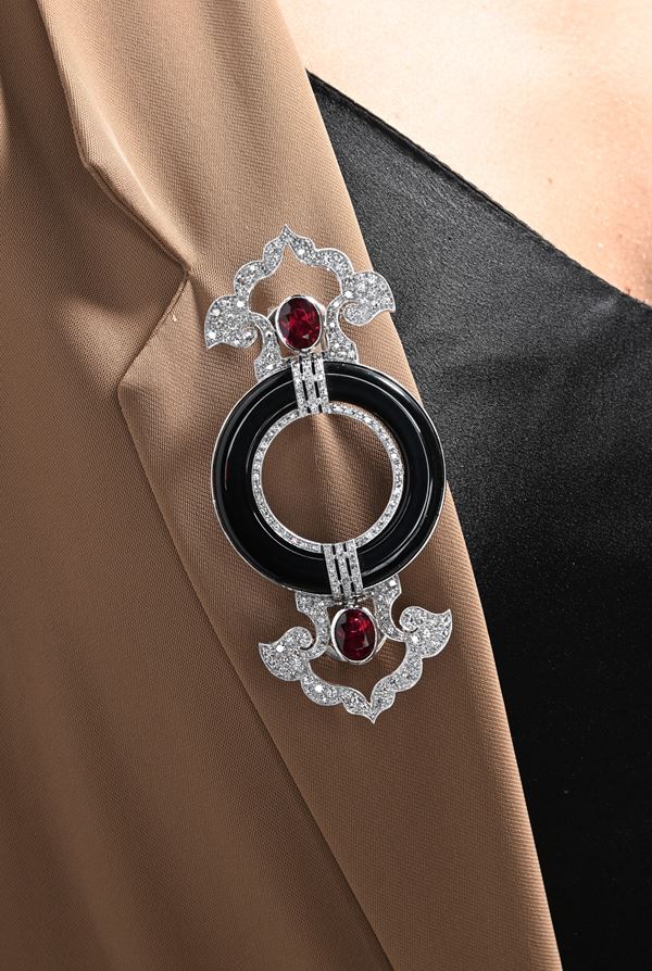 Oro bianco 750/000, diamanti in taglio rotondo brillante ct. 3,50 ca. rubelliti ct. 8 ca. Peso complessivo gr. 47,80.